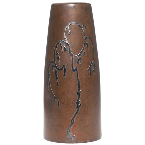 Silver Crest vase, copper with applied silver, original patina, marked,#C7024,6in.h; with an Moriavan sconce,(not shown), Aztec designs, brown, green and tan glaze, unmarked,10in.h, minor chips