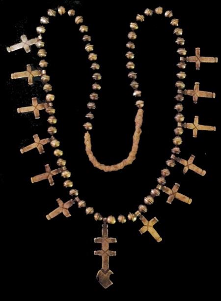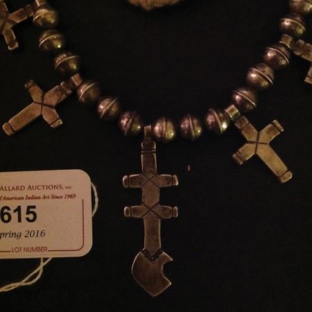 Ca. 1950s-1960s, Vintage Isleta silver cross necklace strung on benchmade beads, with string-wrapped neck. 26" long, pendant 2-1/4"