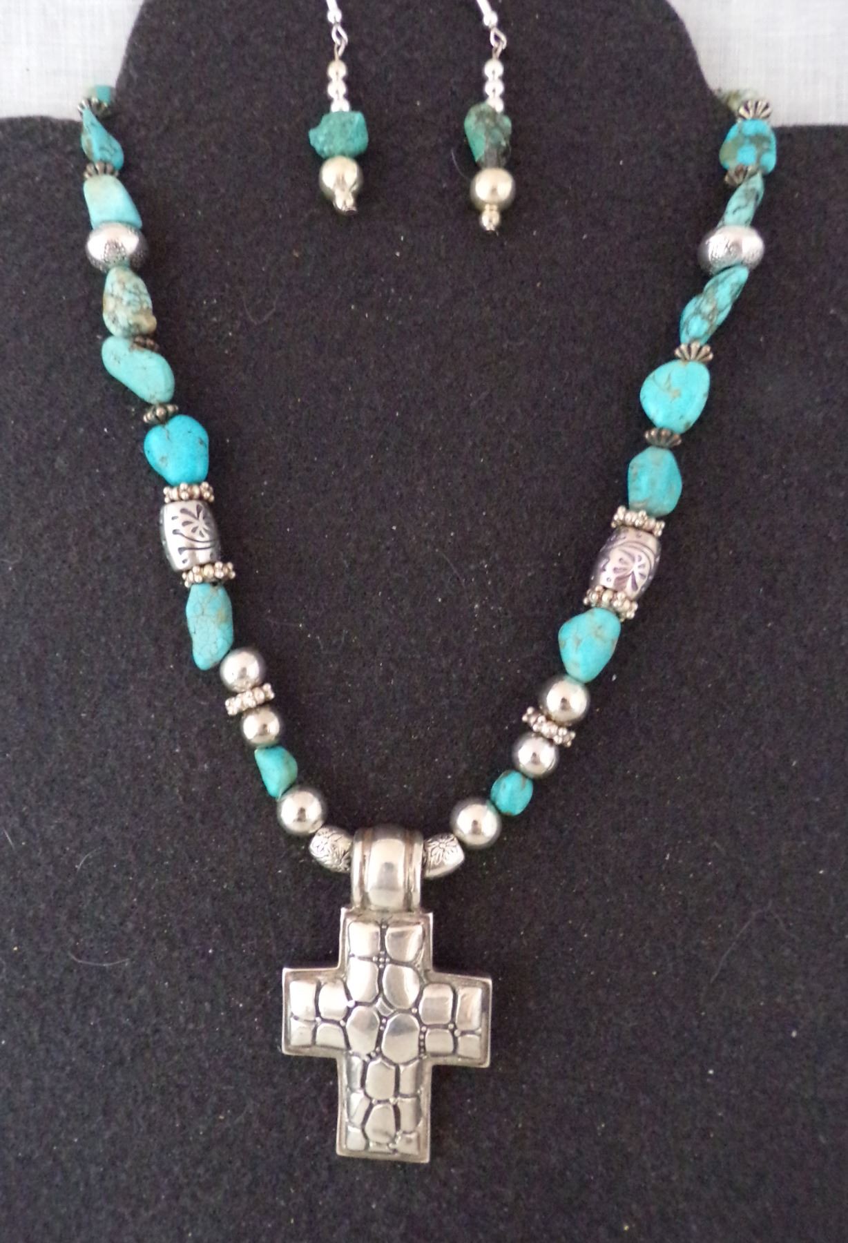 Quail Ridge Studios Silver Cross & Turquoise Nugget Choker and Earrings by Larry McLellan, cobble-stone embossed silver cross pendant is the focal element with natural polished turquoise nuggets, a variety of silver-tone beads are used as spacers, the beaded disc beads, barrel beads, and squash beads are sterling silver, necklace measures 18'', pendant 2'', earrings have a drop of 1.5'' on French wires, The magic of the Desert Southwest is timeless in its display of open landscapes, sunrise and sunset colors with infinite possibilities of artistic expression. The design studio of Quail Ridge was founded on these possibilities, forging an endless variety of earthen gems to their metallic counterparts. The artist, Larry McLellan, designs jewelry contemporary in style, while maintaining elements of native designs.
