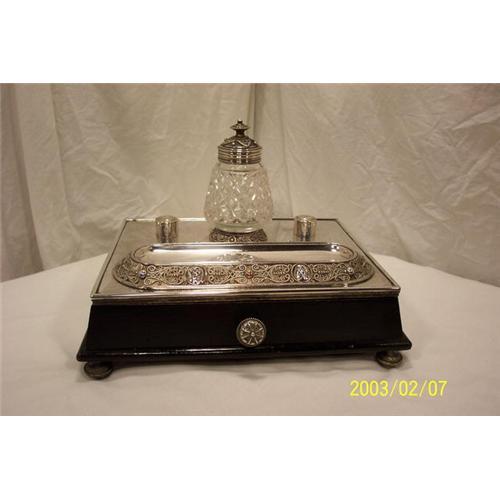 <tr><td>Title:Silver Deskset with Pressed Glass Inkwell and</td></tr>
