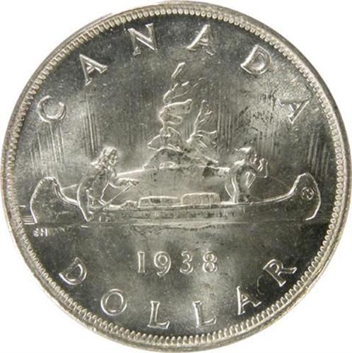 Canada Silver Dollar 1938 ICCS MS-64. This pale golden toned piece is tied sixth highest graded by ICCS