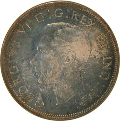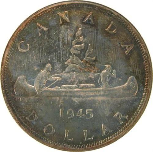 Canada Silver Dollar 1945 NGC MS-65. This is a fully struck and strongly lustrous piece with near flawless surfaces that are attractively toned in a rich mixture of light-medium golden olives, ambers, blues and violets. The major services have graded only five at this level with two higher