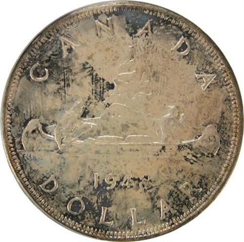 Canada Silver Dollar 1948 PCGS MS-64. This is a fully struck and strongly lustrous piece with near flawless surfaces that are attractively toned in light golden tans with iridescent blue and violet accents. It is tied tenth highest by PCGS