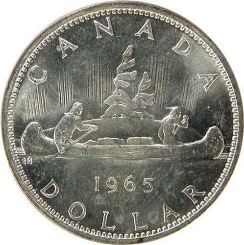 Canada Silver Dollar 1965 Type 1, PCGS MS-65. Great lustre with attractively toned obverse in light-medium golden ambers and blues. Tied as the ninth highest by PCGS