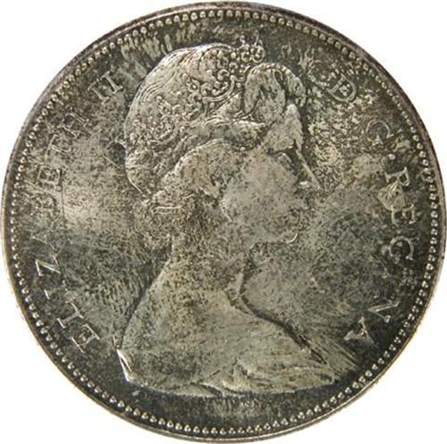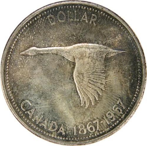Canada Silver Dollar 1967 PCGS MS-65. This is a strongly struck piece toned in light golden tans, olives and blues. It is tied as the eighth highest graded by PCGS