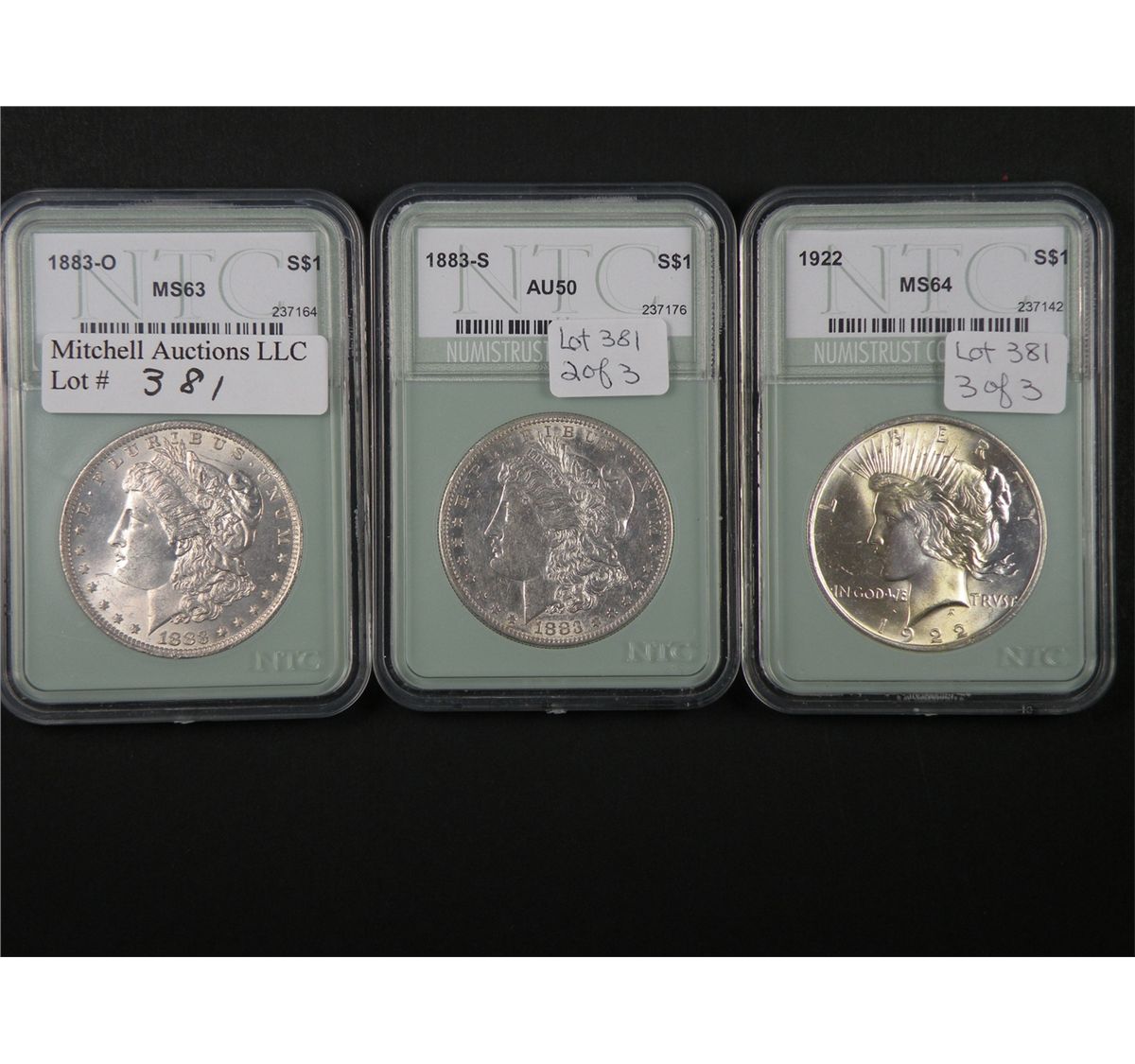 Silver Dollar Trio: 1883-O NTC MS63, 1883-S NTC AU50, 1922 NTC MS64. A total of 3 coins, all quite attractive. Est.$170