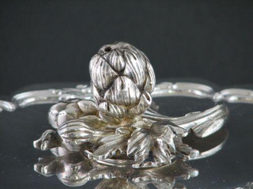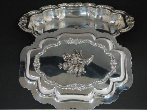 Silverplated double vegetable serving dish with removable ornate floral finial, scalloped edges decorated with scrolls and flowers. Condition: surface scratches typical of aged silver. Dimensions: 5"H x 14"L x 10.5"W.