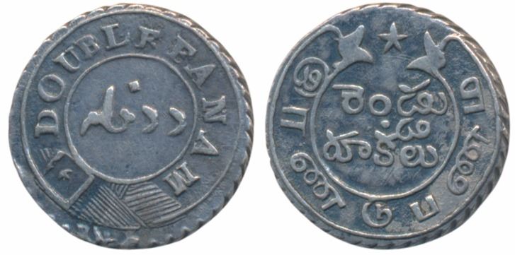 Silver Double or 2 Fanams, 1.76g, 2nd issue, 1808, oblique milling, Square buckled garter on obv., ribbon and star on rev. tri-lingual (Prid 184, KM 350). Very Fine+, Rare.