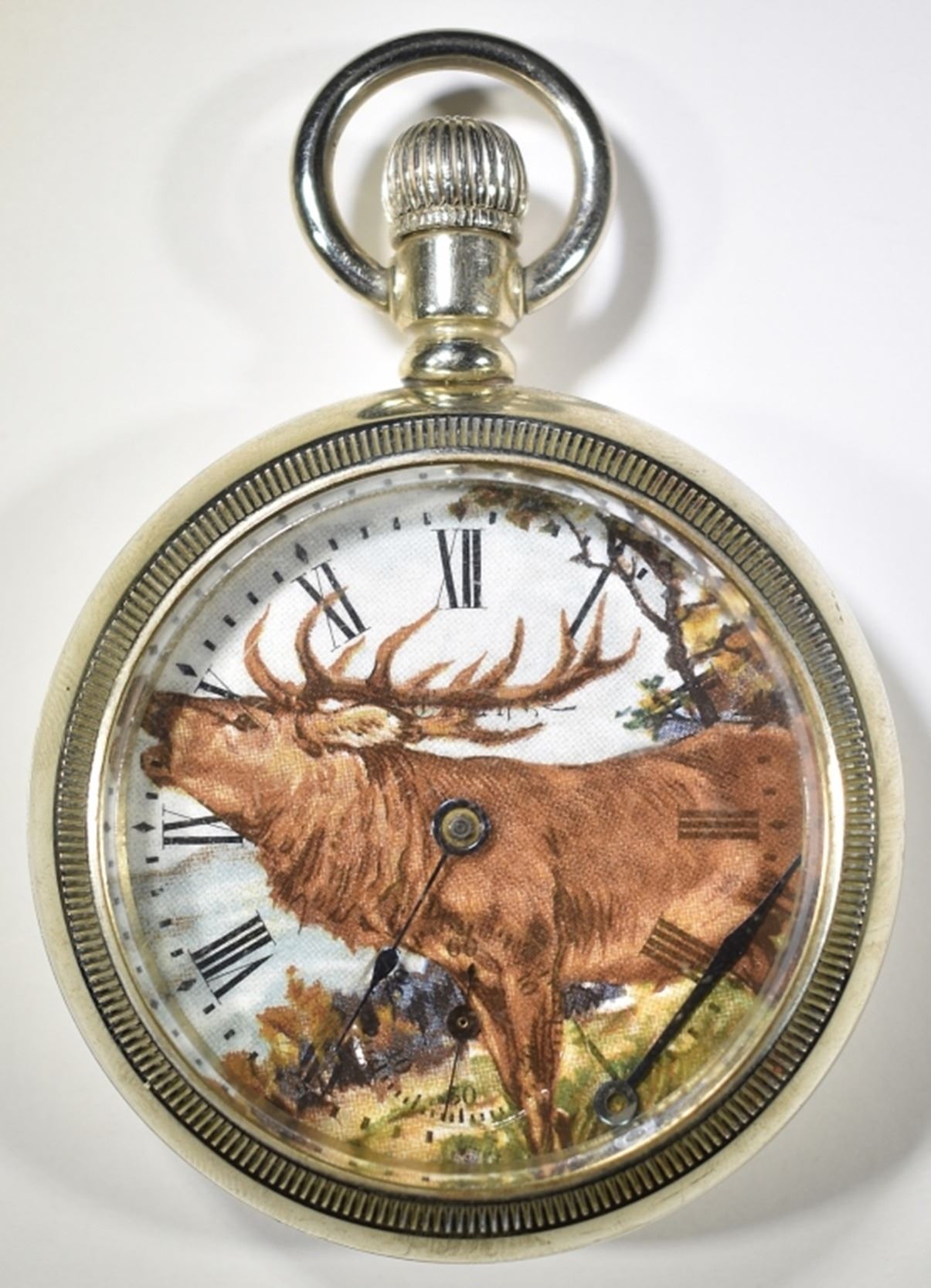 18 size, Serial #22811694. The open face of this watch has a beautiful full color custom dial of a moose in the wild. Made of Nickel Silver, back is plain. Missing Lever, Swing Out Movement. ESTIMATE $300 - $400.