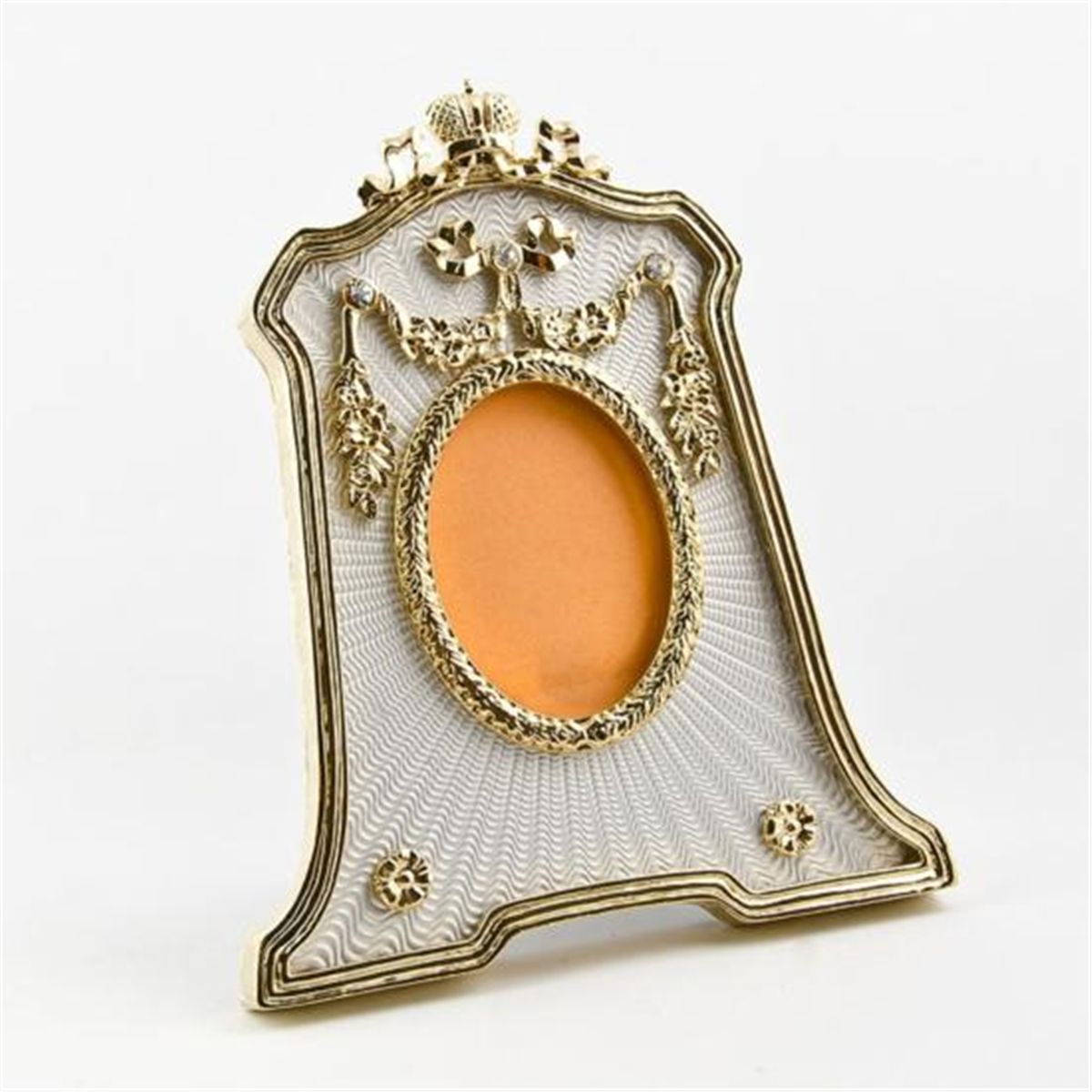 Silver Enameled Faberge Frame, This silver guilloche enamed photo frame contains golden garlands suspended from elegant crystals, the top of which is a ribbon cresting. Dimensions: 4.5in (H) x 3.75in (L), Material: Pewter, Enamel, Crystals