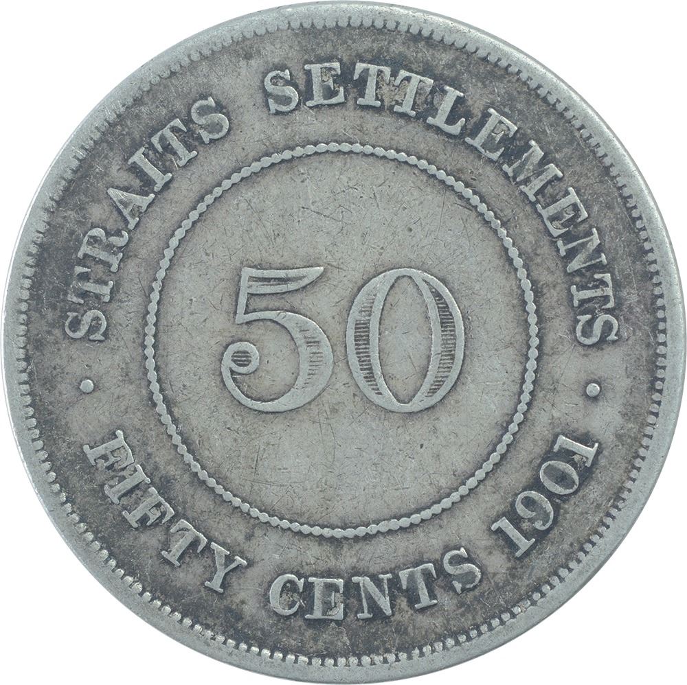 Straits Settlements, VictoriaQueen, Silver 50 Cent, 1901 AD, Obv: crowned head left, Legend: VICTORIA QUEEN, Rev: value with beaded, circle, Legend:Straits Settlements, 13.41g, 30.84mm, about very fine.