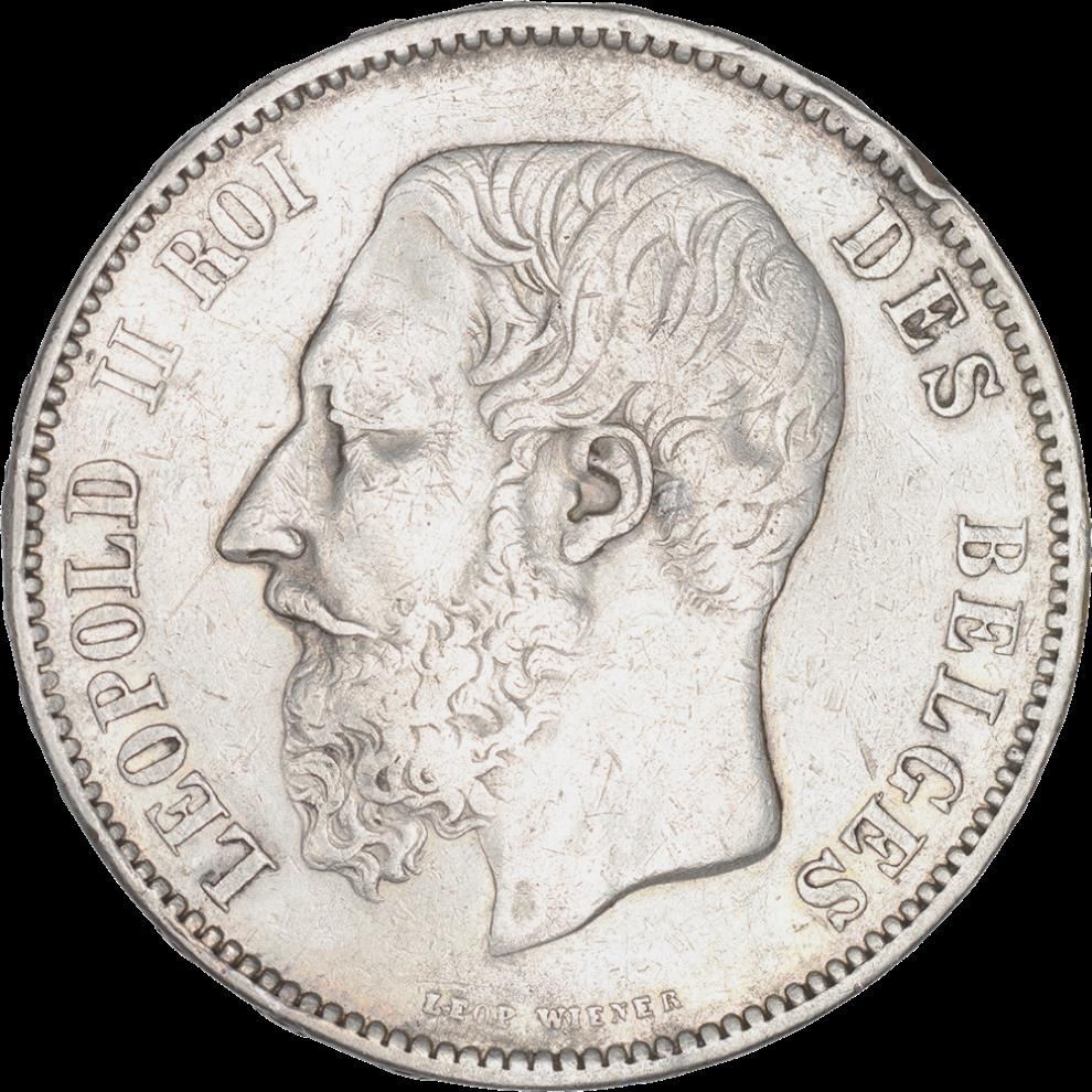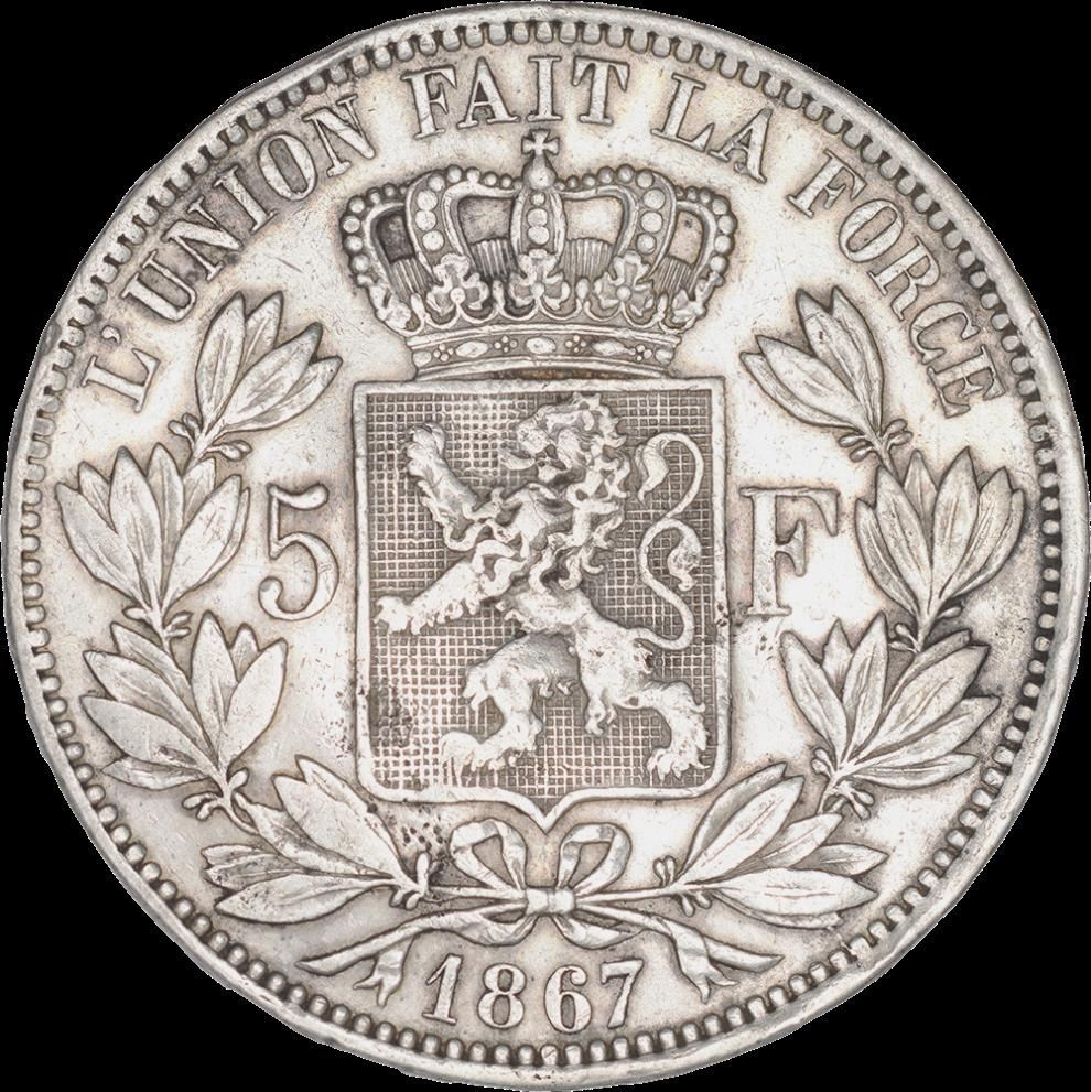 Belgium, Leopold II, Silver 5 Francs, Obv: LEOPOLD II ROI DES BELGES, bust of Leopold II left, LEOP WIENER below truncationRev: LUNION FAIT LA FORCE / 1867, arms of Belgium at center, flanked by denomination: 5 [-] F, all within laurel wreath, 24.75g, 37.00mm, about very fine.