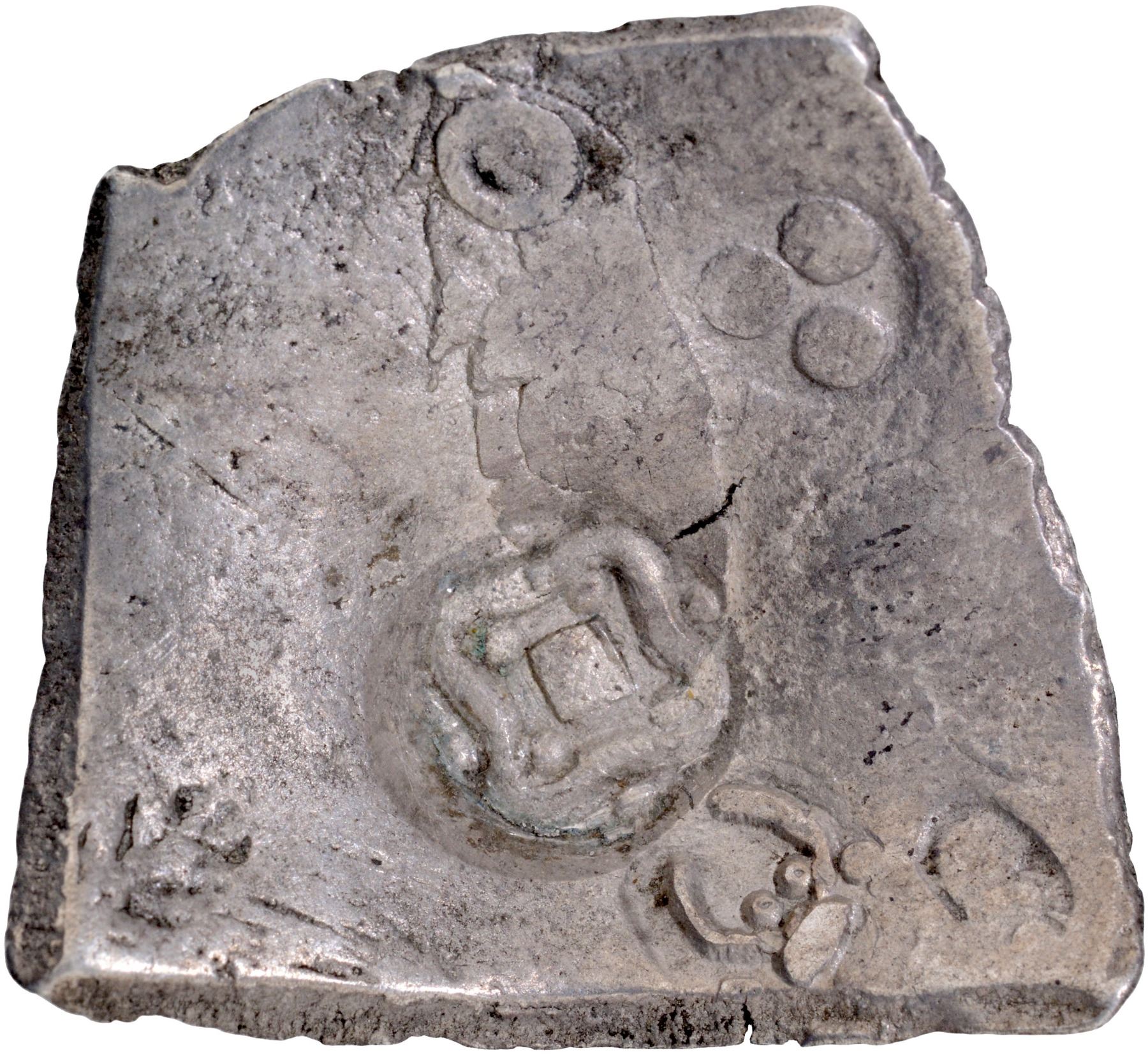 Punch Marked Coin, Shakya Janapada (600-500 BC), Narhan Hoard type, Silver 5 Shana, Scyphate, Archaic period, Obv: a single bold punched symbol consisting of a central symbol with four small dots around the square pellet, all within a quatrefoil, banker’s marks including a taurine and other ancillary symbols around the field, Rev: uniface, 6.28g, 28.9x25.5mm, (Hardekar, 2019 # NH 32/Unlisted in Rajgors), choice extremely fine, Very Rare.