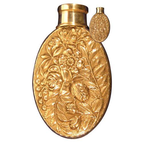 Silver Flask with embossed floral design, with rare collapsible cup lid. Excellent condition. 3 3/4 X 6 1/4 inches.