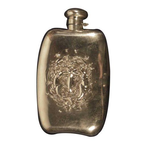 Sterling Silver Flask with embossed mermaids on front and monogram on back. Excellent condition. 4 X 6 1/2 inches.