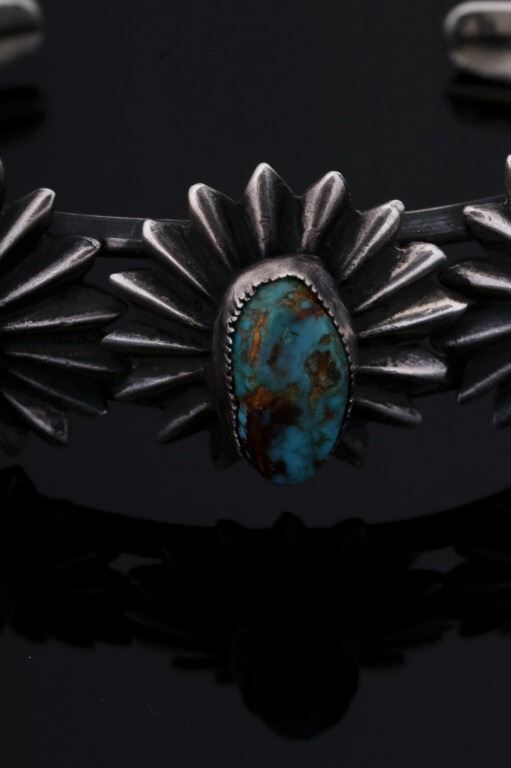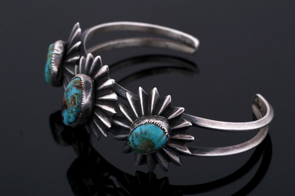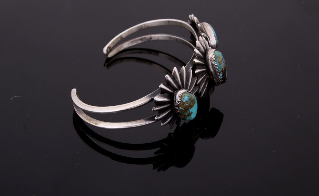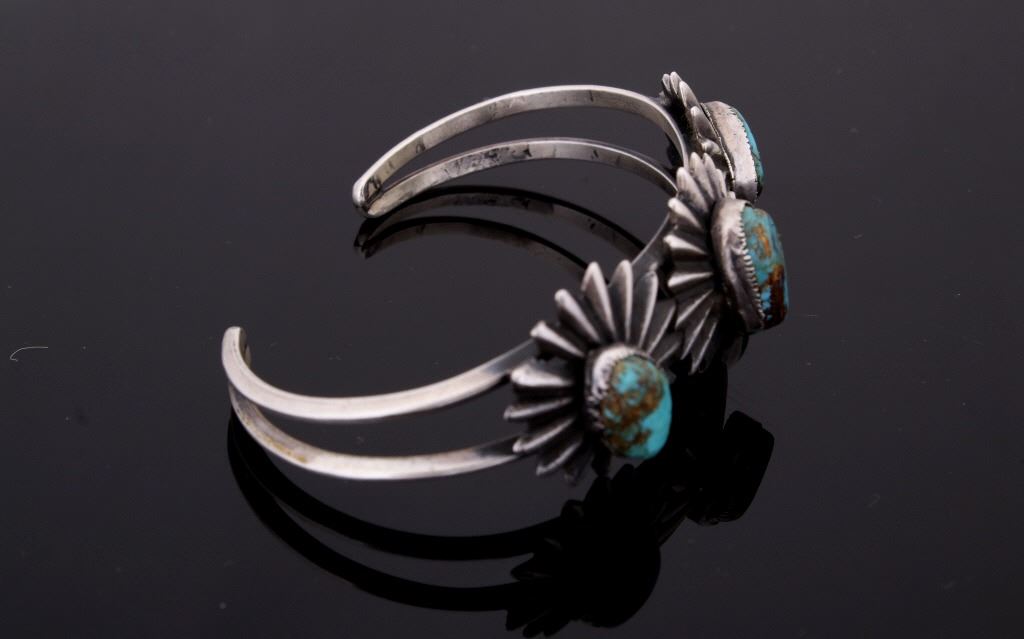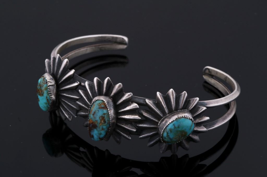 For your bidding pleasure is this Silver Floral Bracelet w/ Red Mountain Turquoise. This silver bracelet is in good condition showing two triangular silver bars that join and fork to make the band which the silver flowers with three Red Mountain Turquoise stones centered on the flowers. Each stone has intricate spider webbing that really accentuates the bracelet. The measurements of this bracelet is 2 1/2" x 2". The approximate measurements of the circumference of the bracelet is 4 1/2".