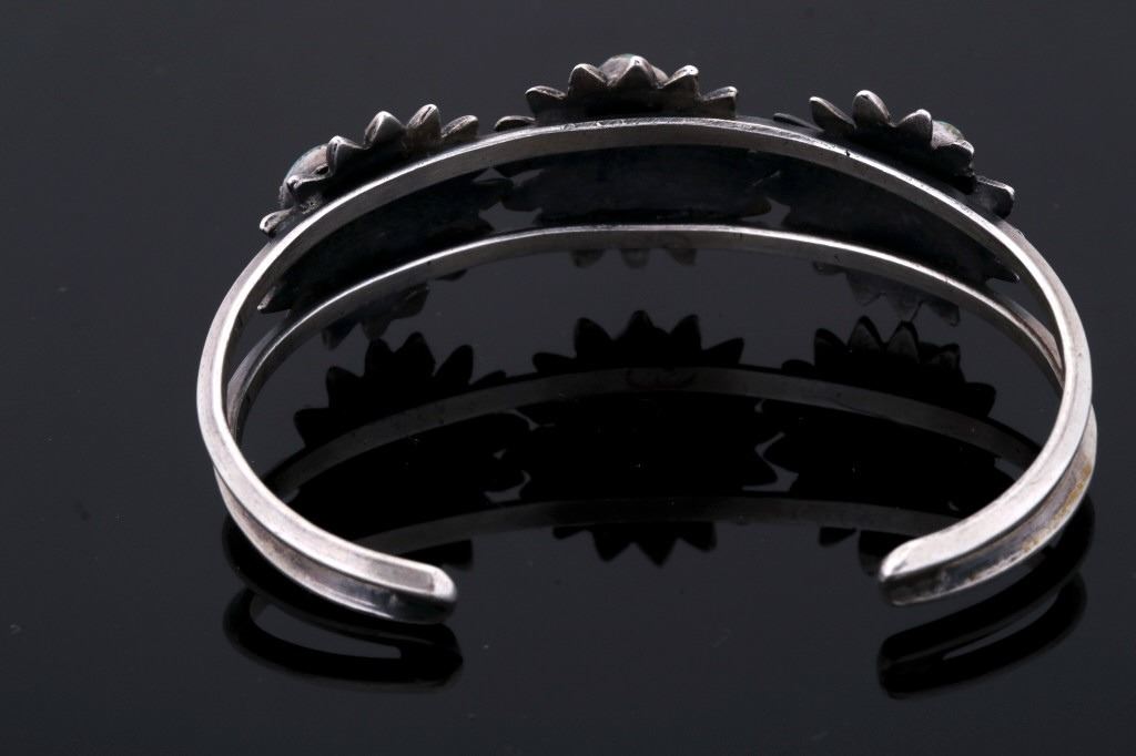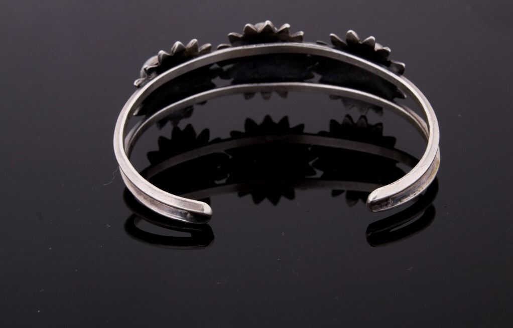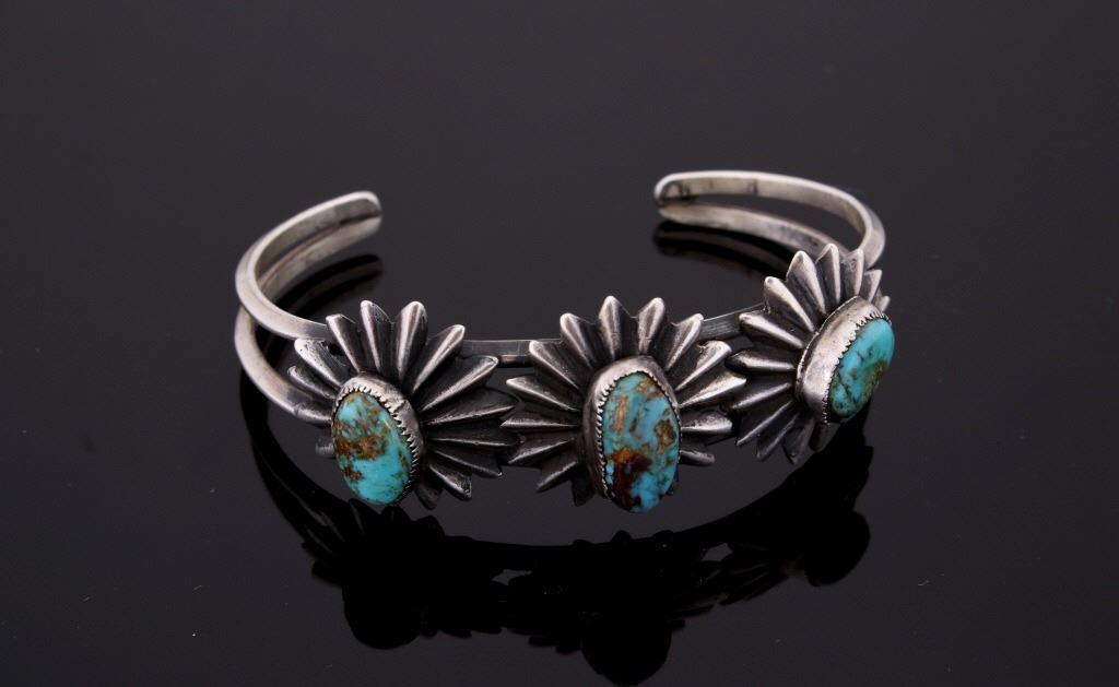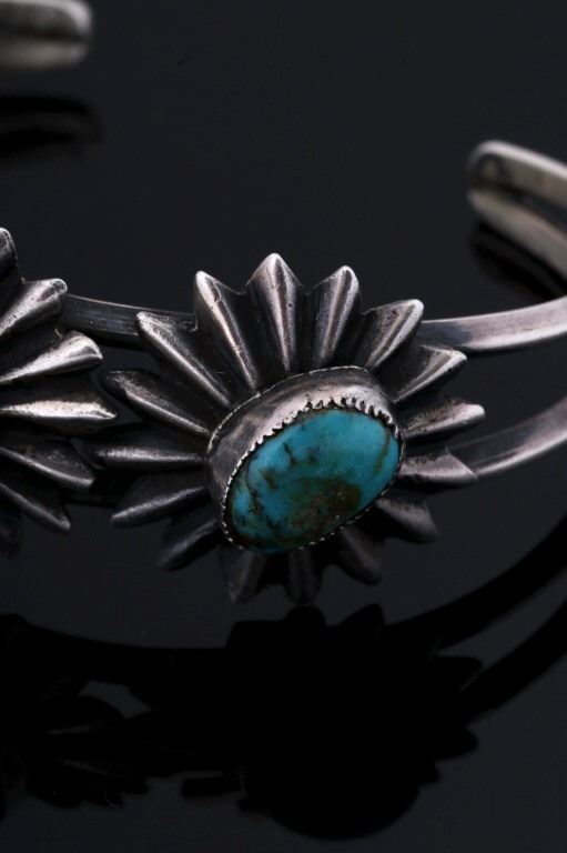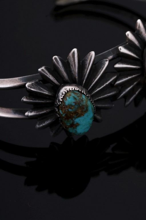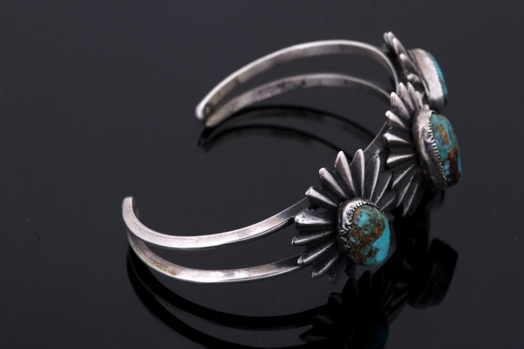 For your bidding pleasure is this Silver Floral Bracelet w/ Red Mountain Turquoise. This silver bracelet is in good condition showing two triangular silver bars that join and fork to make the band which the silver flowers with three Red Mountain Turquoise stones centered on the flowers. Each stone has intricate spider webbing that really accentuates the bracelet. The measurements of this bracelet is 2 1/2" x 2". The approximate measurements of the circumference of the bracelet is 4 1/2".