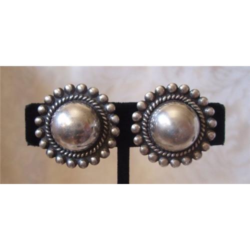 Gorgeous bold and chunky sterling silver hemi round cabochon with ornate trim screw back earrings. These are fantastic smooth polished cabochons framed with small rope detail and a dotted edge. The craftsmanship is superb and they have a rich heavy age appropriate patina with screw backs. They are very reminiscent of old Taxco work.
