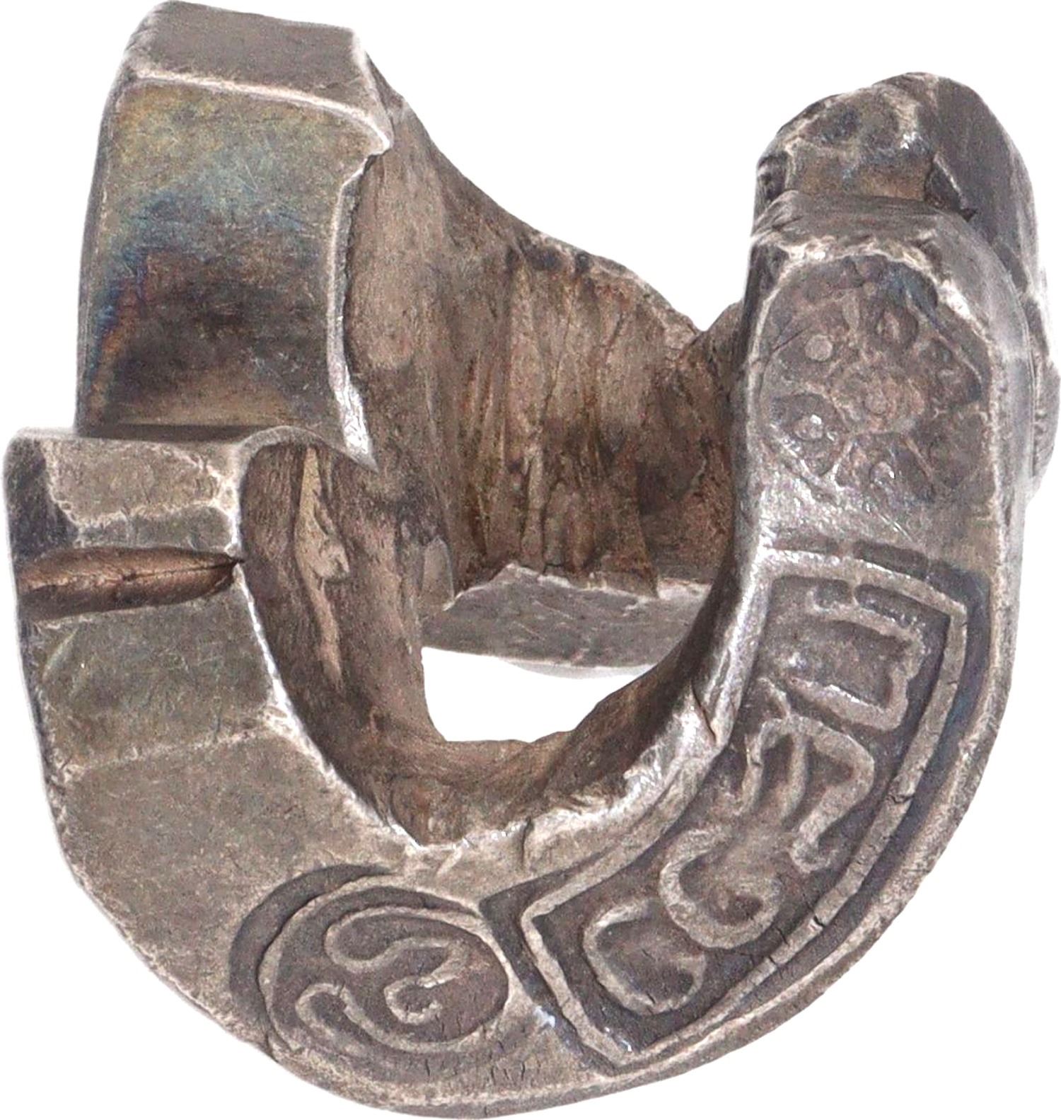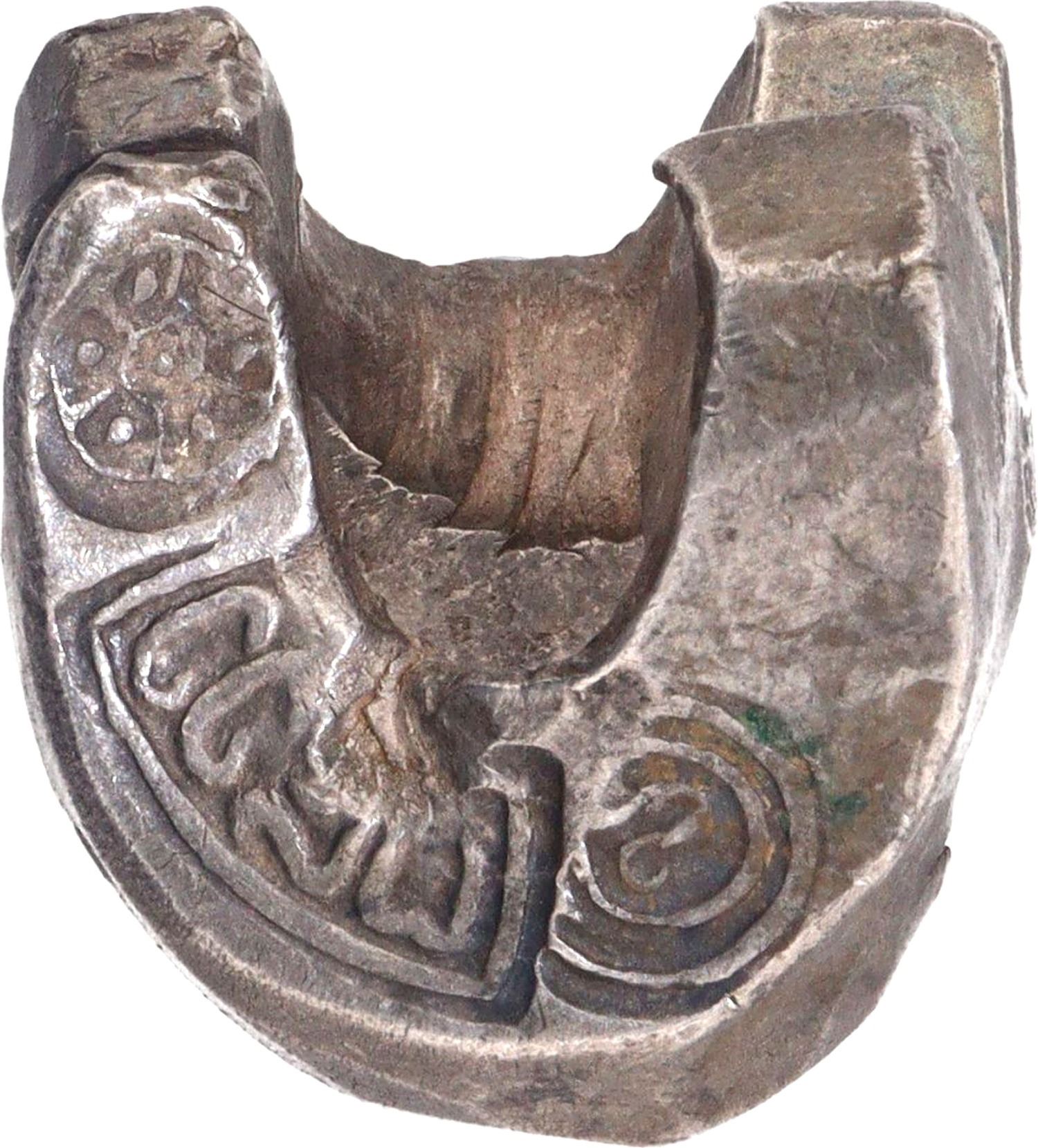 Thailand, Northern Siam (1200-1700 CE), Silver 4 Baht, Silver bar Kaikam (Chiang Money), a curved silver bar used as currency, the bars are stamped with three marks. The first stamp is the number ‘4’ which denotes the value/weight of 4 Baht, the second middle stamp is the city ‘Chiagsean’ mint mark and the third is the royal mark indicating the reign. or assayer, 64.5g, 26.06x29.12mm, XF-AUNC, Very Rare.
