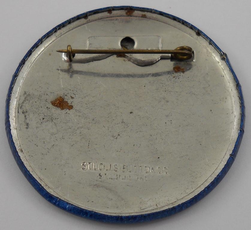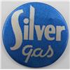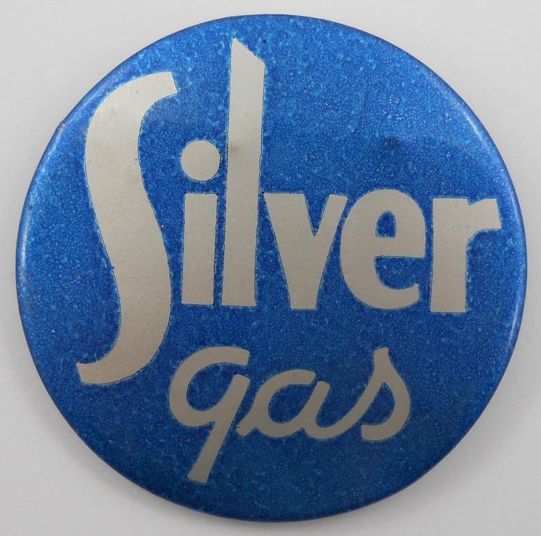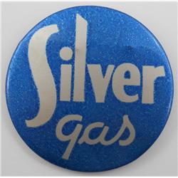 2-1/4" in diameter. Silver Gas was in Montana during the 1930's - early 50's. This is an original badge from St. Louis Button Co. It has a celluloid face and a metal back with a pin. There is a small dent to the top right but other than that the badge is sharp and crisp. This is a hard to find badge.