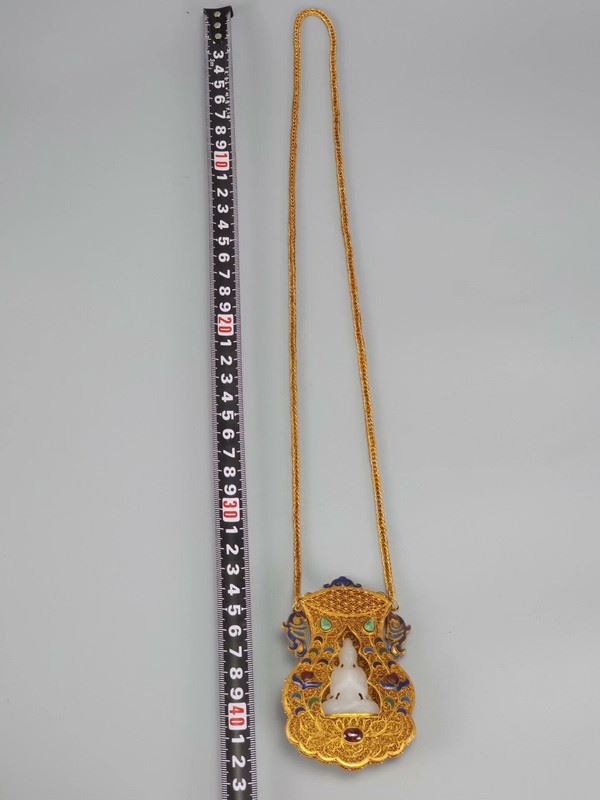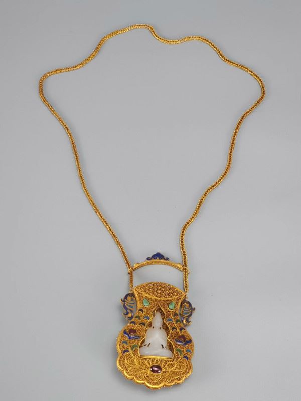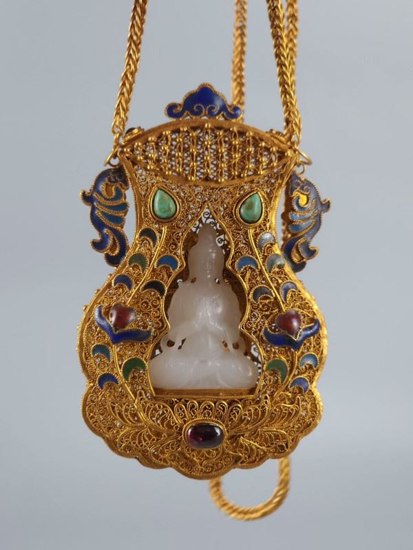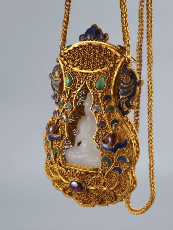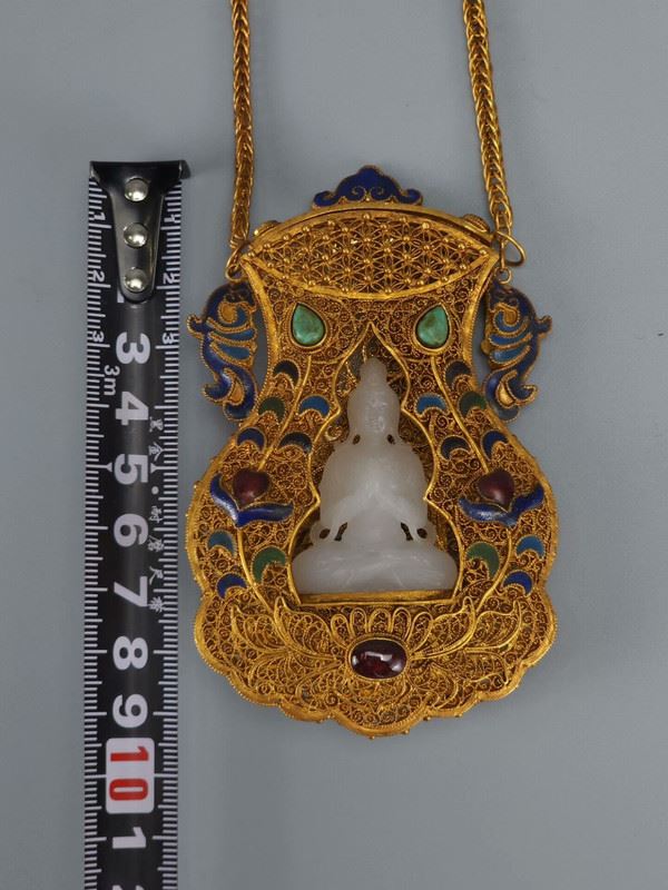This exquisite amulet features a finely crafted silver-gilded frame with intricate floral designs, surrounding a serene Buddha figure carved from jade. The piece is further adorned with colorful gemstones, creating a harmonious blend of materials. It is suspended on a delicate chain, embodying both spiritual and artistic beauty.
