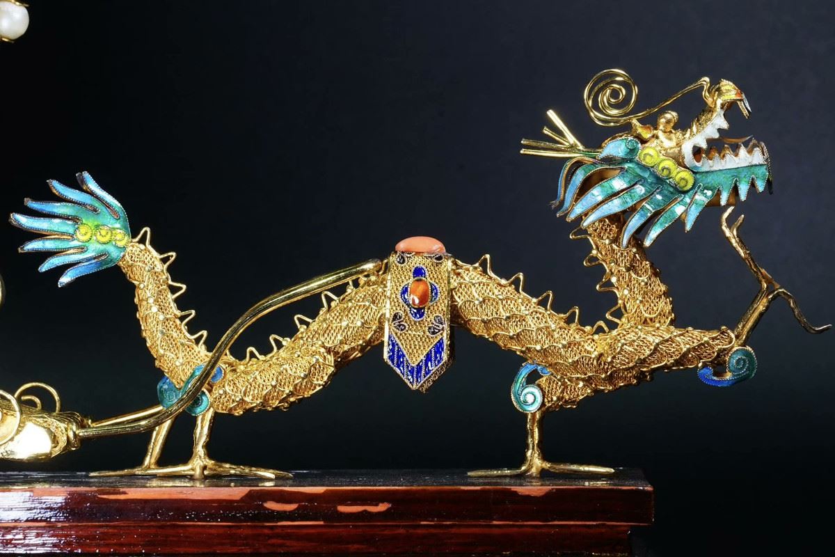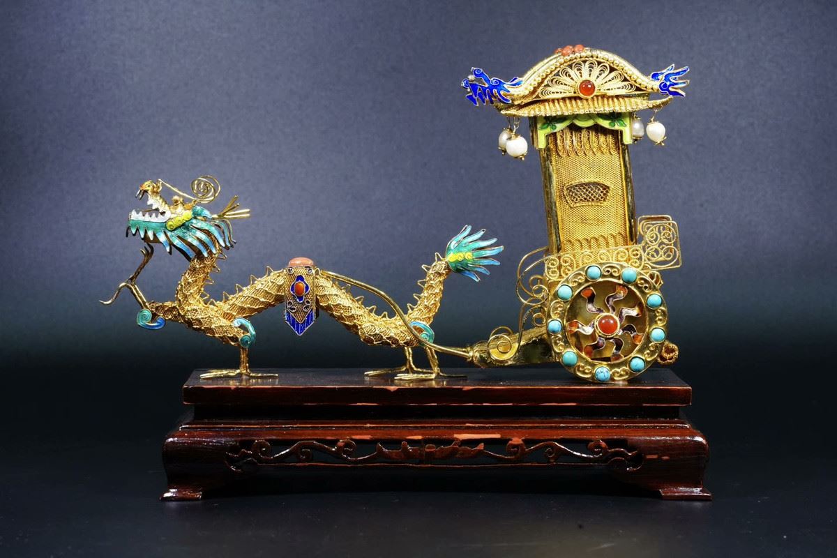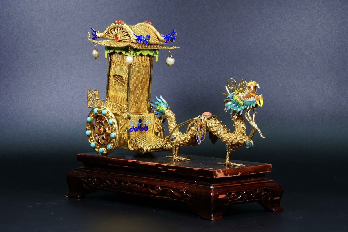 This silver gilded dragon pulling floral palanquin ornament combines exquisite silver gilding craftsmanship with traditional dragon motifs. The dragon symbolizes power and nobility in Chinese culture, while the floral palanquin represents ancient wedding and ceremonial traditions. The finely crafted carving and luxurious metallic decoration showcase both the brilliance of ancient craftsmanship and the profound heritage of Chinese culture.