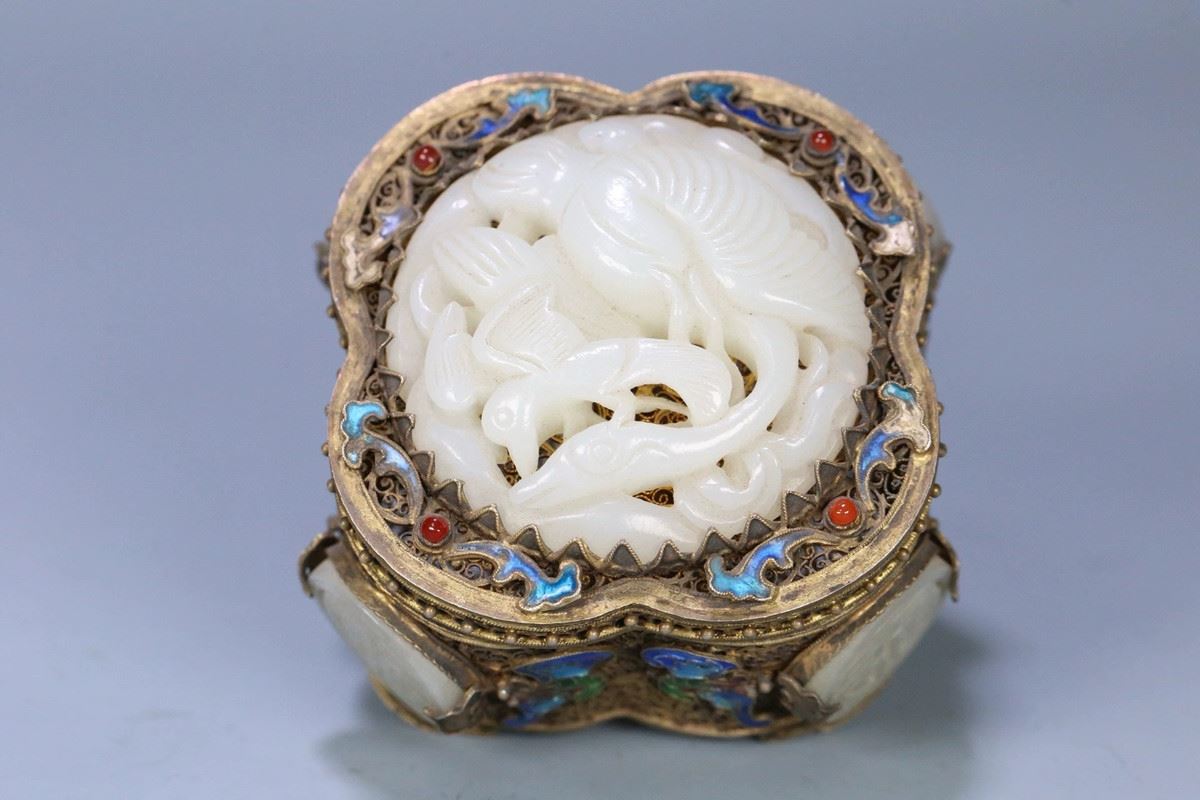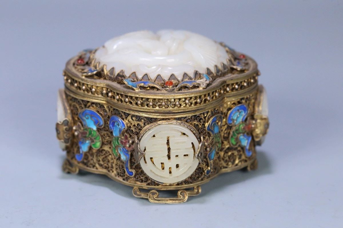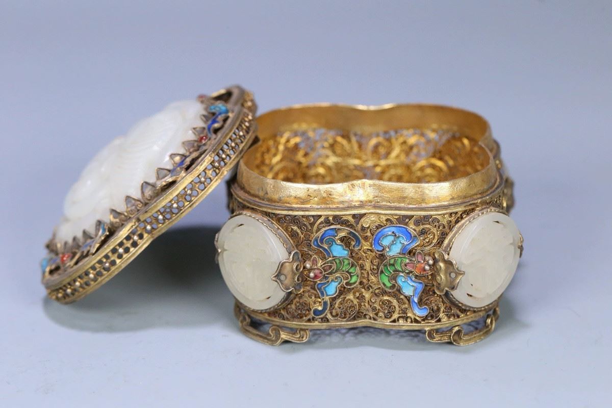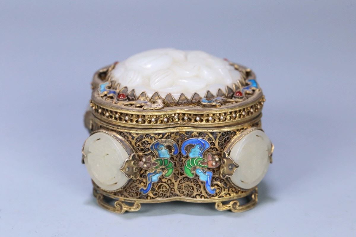 This box combines exquisite silver filigree craftsmanship with precious Hetian jade, presenting high artistic value and functionality. The body of the box is adorned with intricate silver filigree work, with gilded gold accents enhancing the elegance and luxury of its appearance. The lid is crafted from fine Hetian jade, its white, lustrous texture conveying a sense of nobility and refinement. The overall design combines traditional craftsmanship with modern artistic appeal, making it a collectible masterpiece.