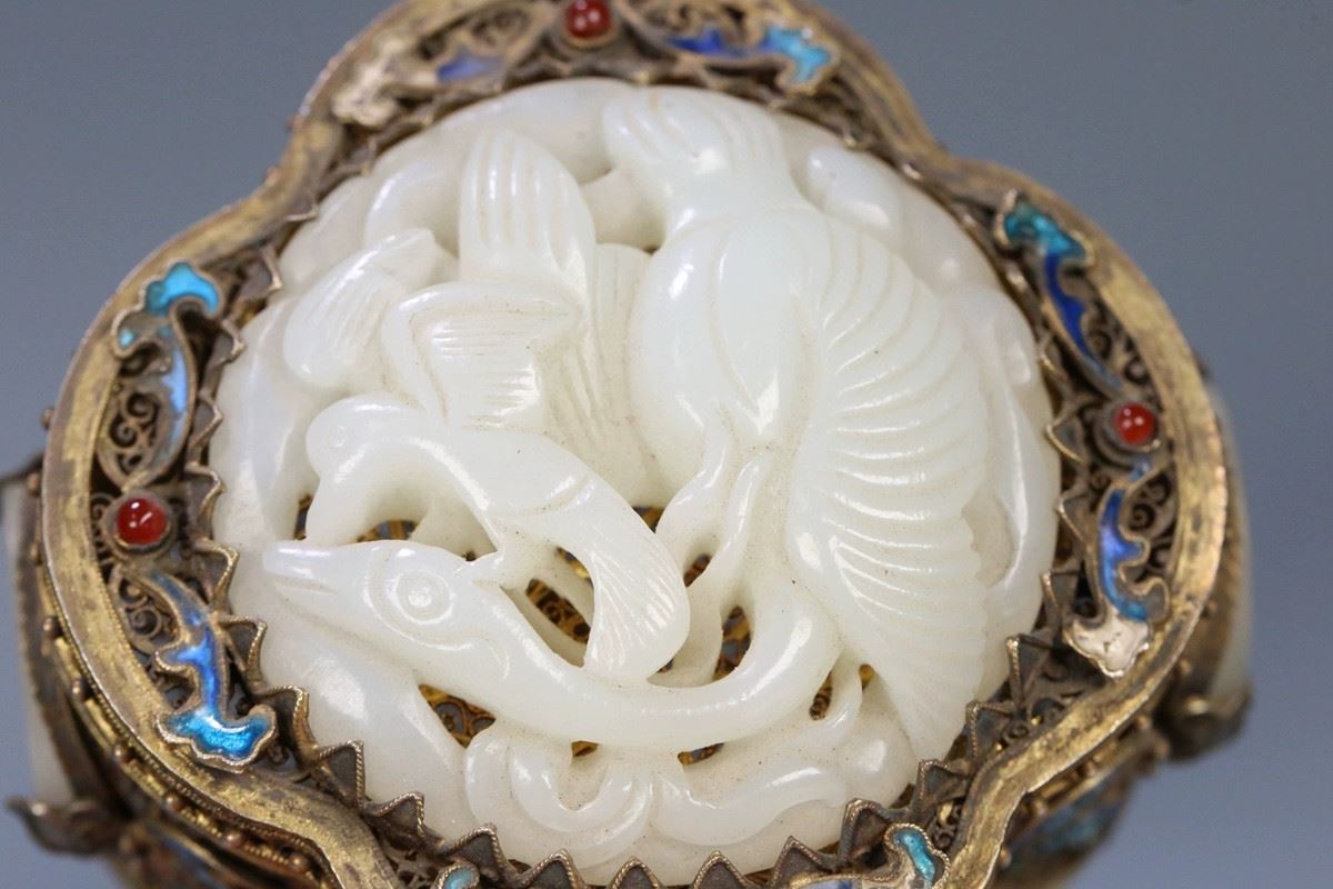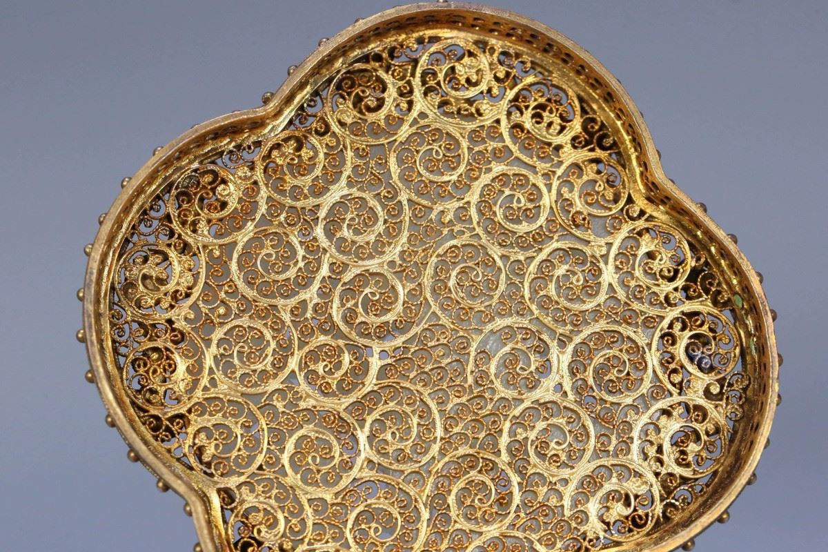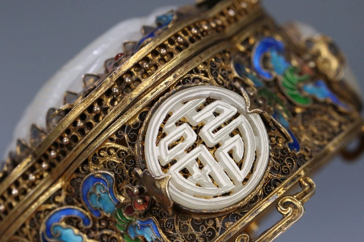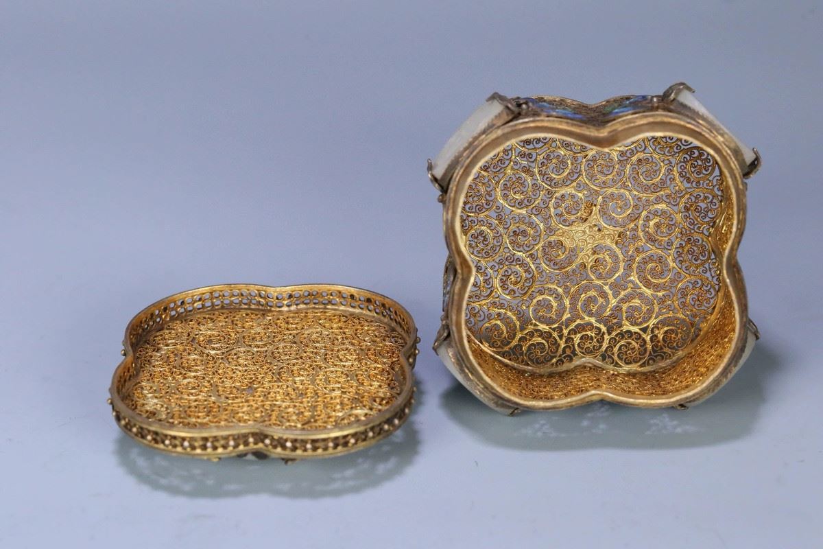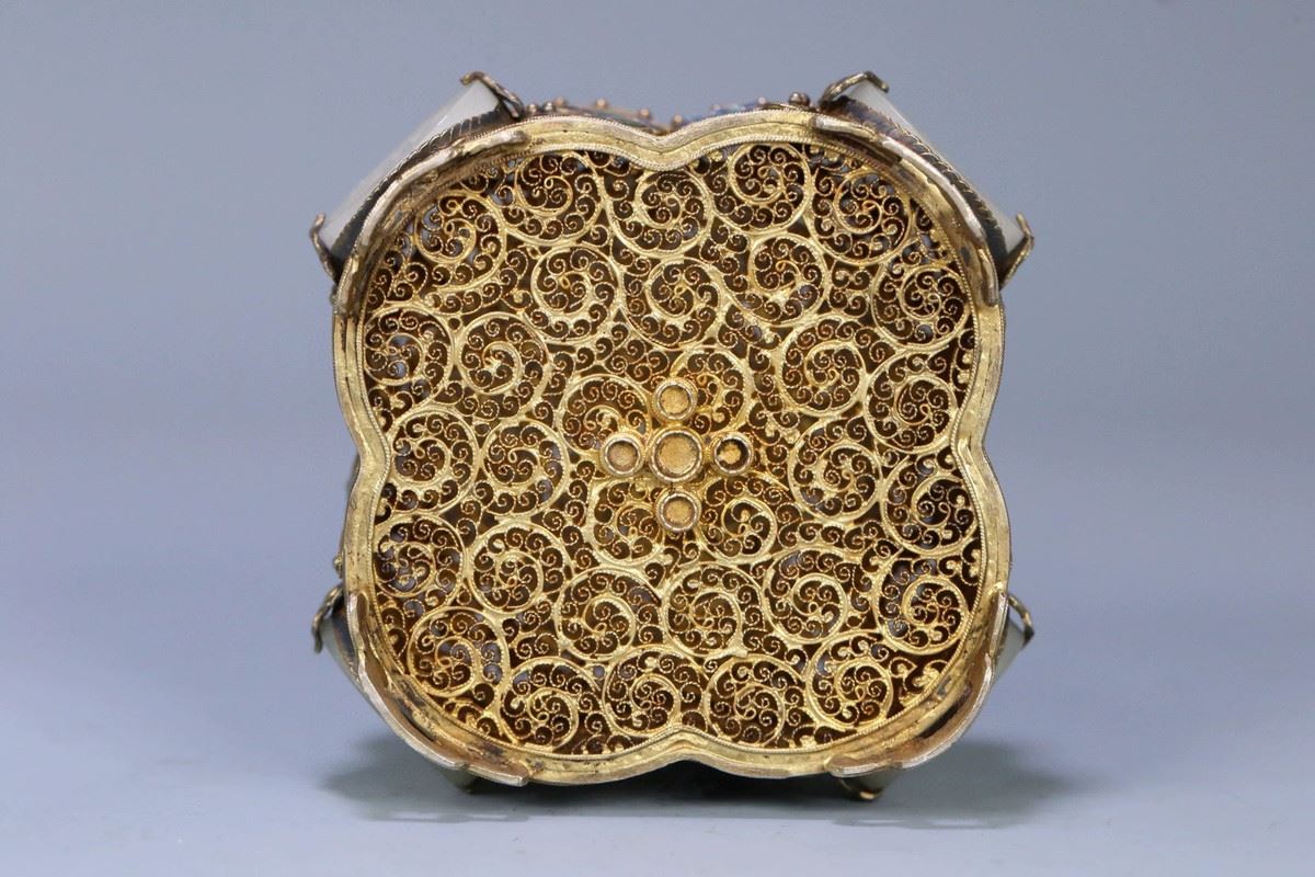 This box combines exquisite silver filigree craftsmanship with precious Hetian jade, presenting high artistic value and functionality. The body of the box is adorned with intricate silver filigree work, with gilded gold accents enhancing the elegance and luxury of its appearance. The lid is crafted from fine Hetian jade, its white, lustrous texture conveying a sense of nobility and refinement. The overall design combines traditional craftsmanship with modern artistic appeal, making it a collectible masterpiece.
