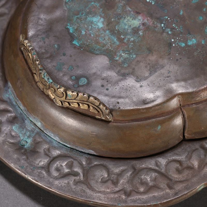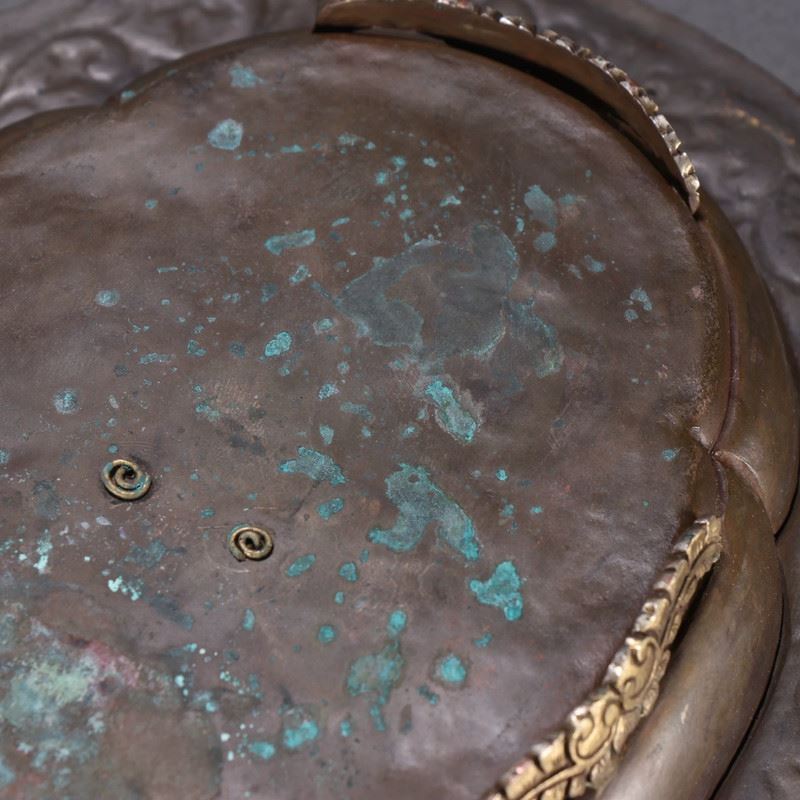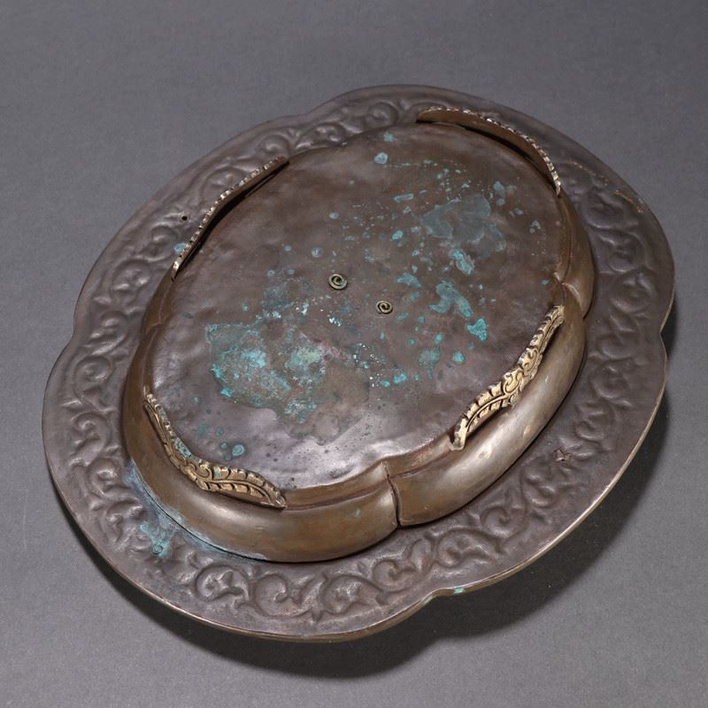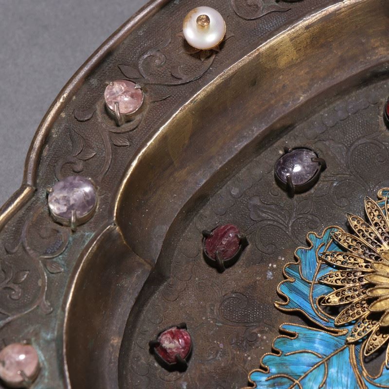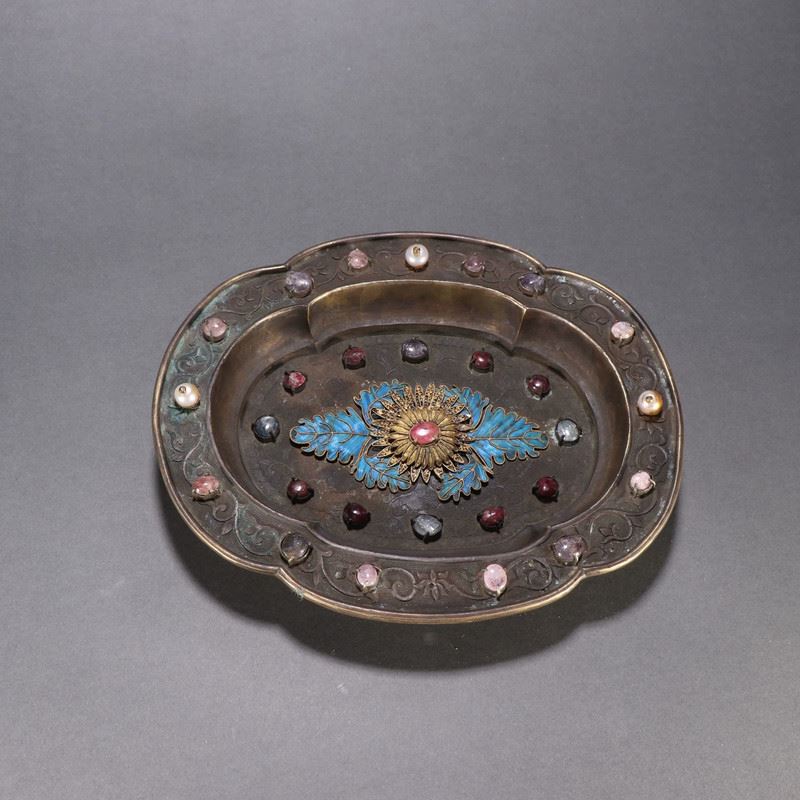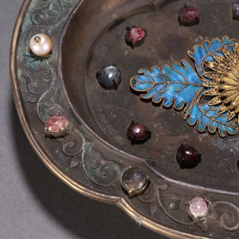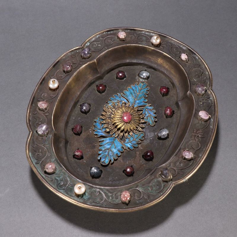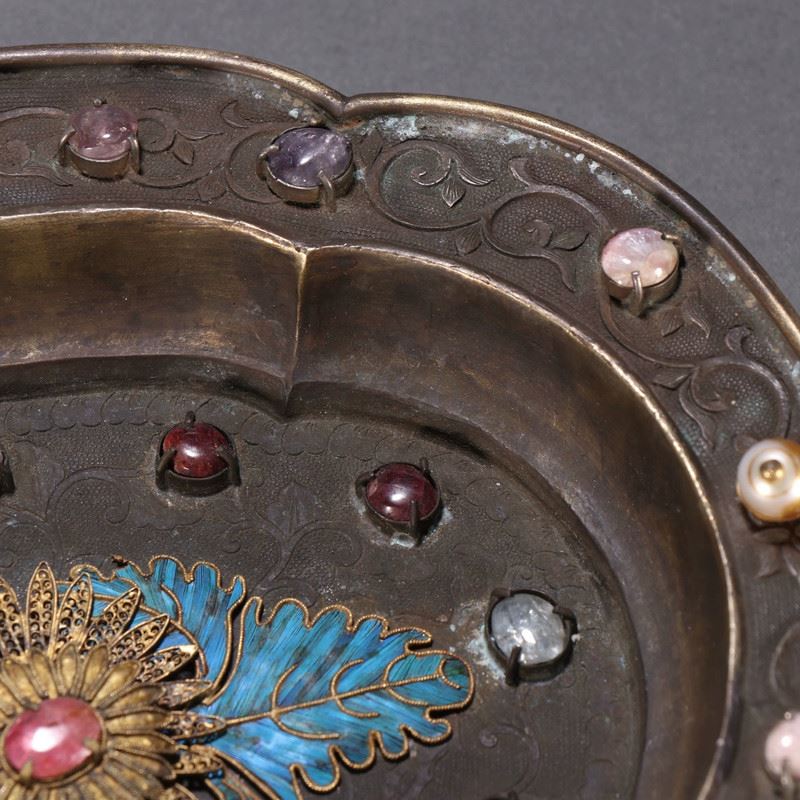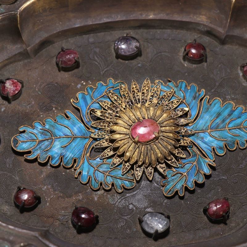 This is an exquisite silver-gilded plate featuring intricate cloisonné enamel decoration at its center, surrounded by carefully inlaid tourmaline gemstones. The plate combines silver craftsmanship with the art of gemstone inlay, creating a vibrant and elegant piece that showcases the artisan's skill and creativity. It is a rare artifact that balances both artistic beauty and functionality.