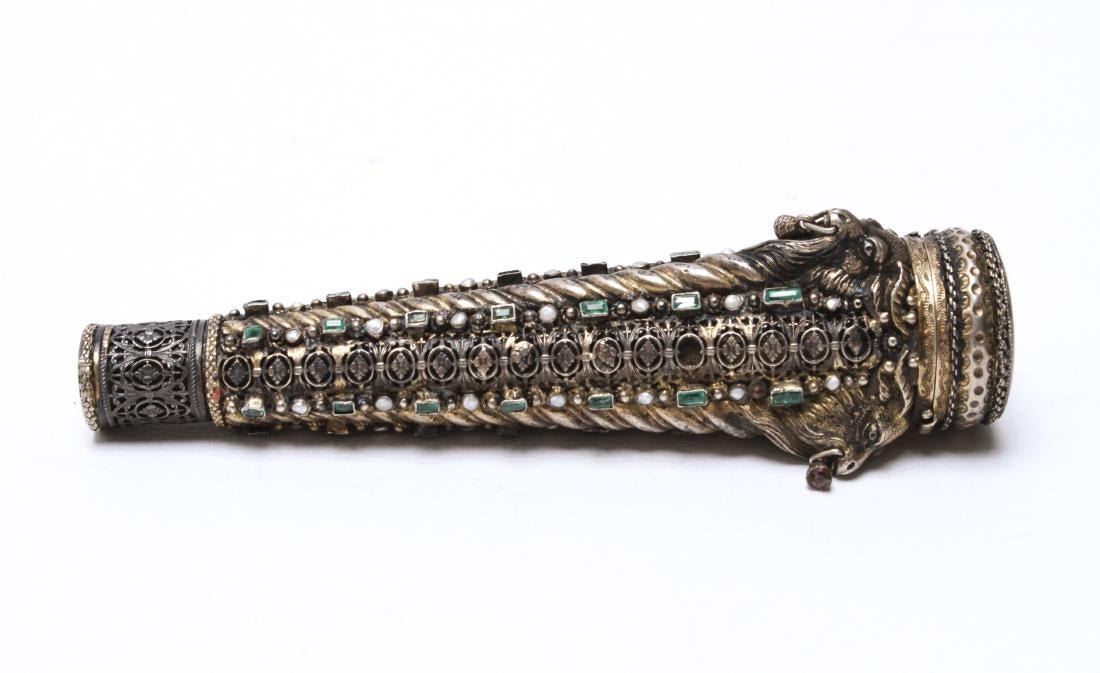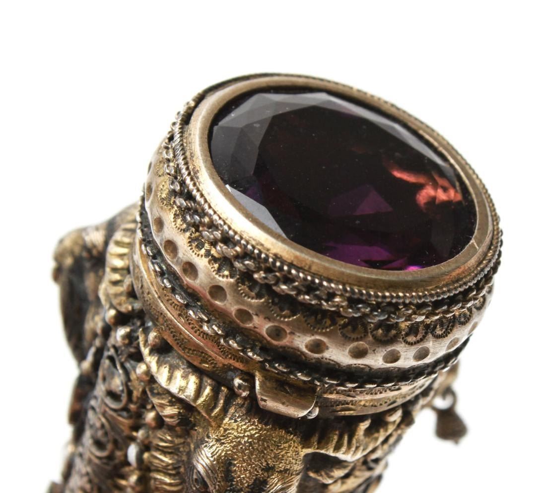 Silver-gilt cane / walking stick handle with three figural goat heads with bells and pierced floral motif, emeralds, pearls and a large faceted amethyst hinged lidded compartment, circa 1890. 5.125 L. Approx 3.91 ozt inclusive.