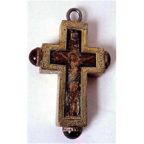 This silver gilt pectoral cross, measuring 3" x 2 7/8" portrays a crucifixion on the front and an apostle on the reverse. His name written in Greek, appears illegible (to me) above the figure. The painted figures are on gesso over wood, in icon style, and appear to be Orthodox and probably mid to late 18th century. The reverse is missing its "cross" frame, although a shadow is visible where it once was. The painted cross insert is held in place with three red stones.