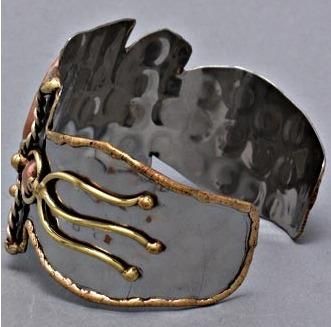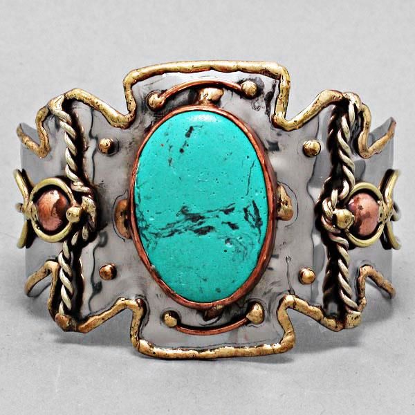 This bracelet has a two tone silver and gold tone band with rustic ornamentation and turquoise stone. Color : Two Tone / Turquoise Size : 2" H, Cuff Condition: Excellent