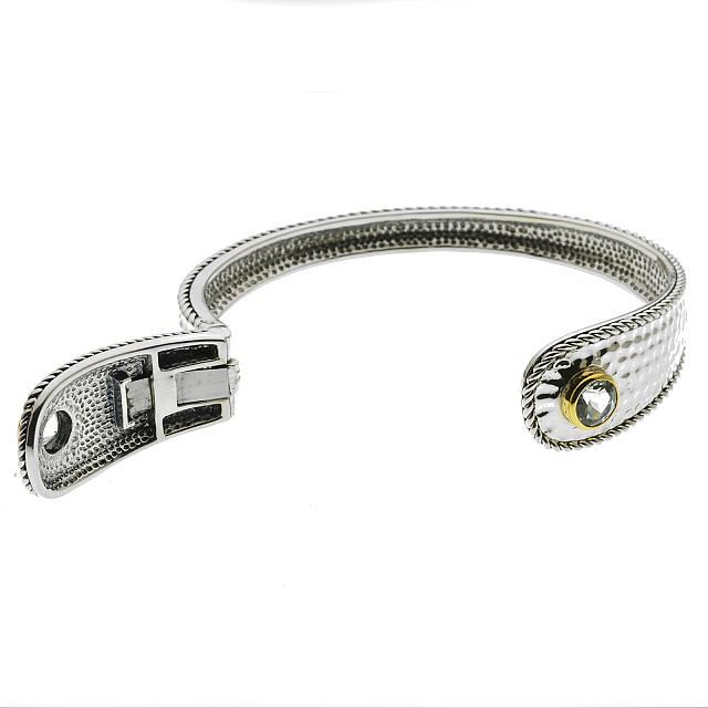 Addison Lane beautifully juxtaposes genuine Brazilian amethyst gemstones with sterling silver with a lovely hammered texture and 14k yellow gold bezels to craft this lovely cuff from the Mara Collection.