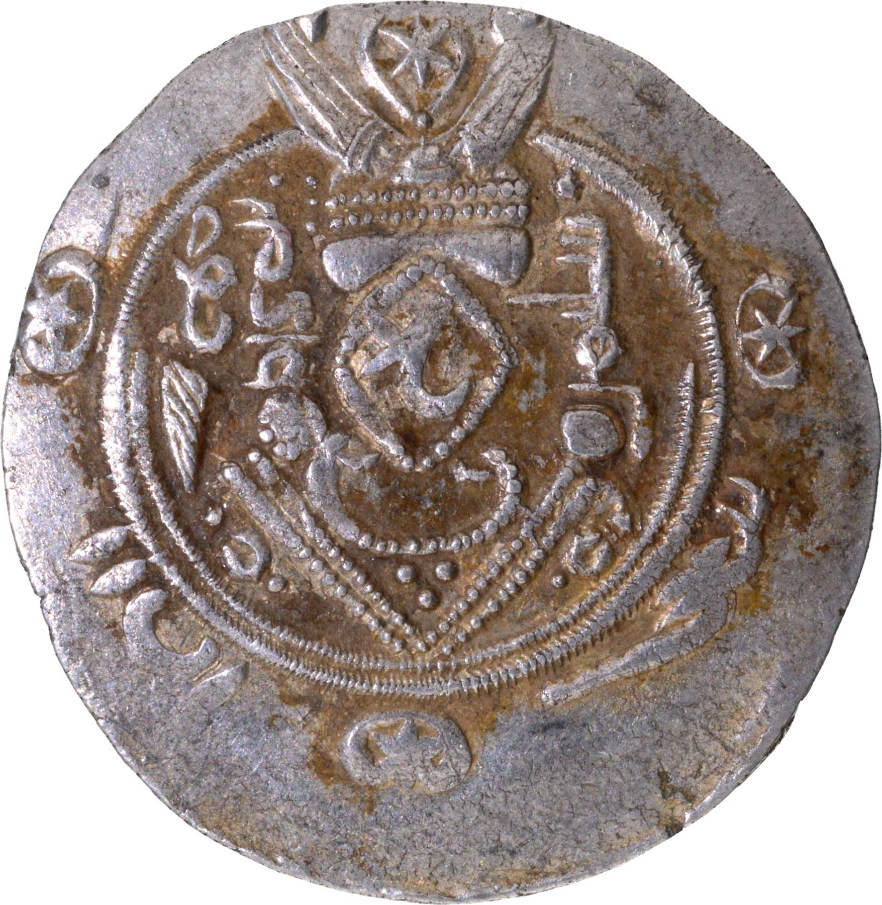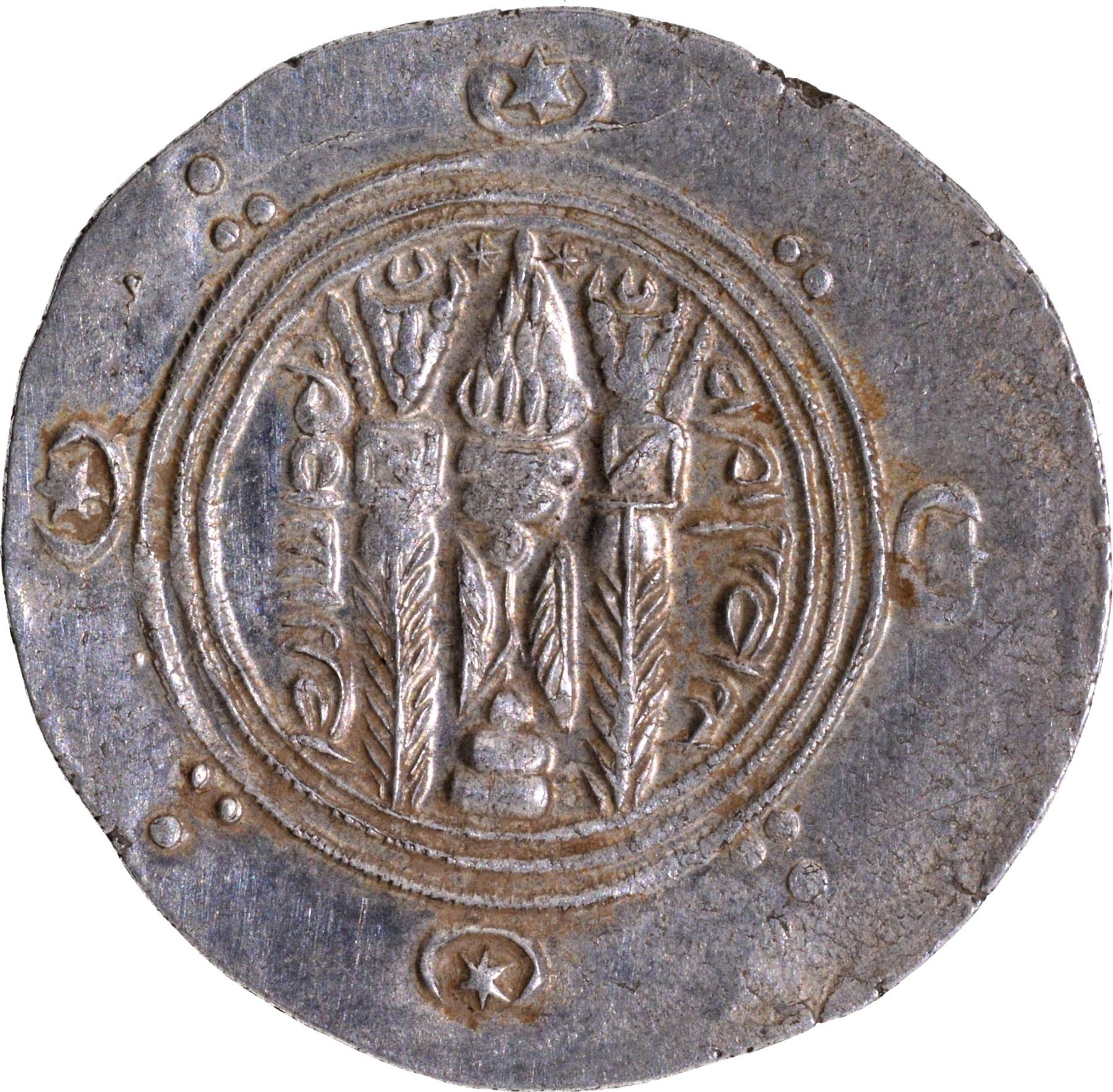 Arab Sassanians, Abbasid Governors of Tabaristan, Sulayman (787-789 CE), Silver ½ Dirham, Silver 1/2 Drachma, Obv: crowned and cuirassed bust of the king facing right, marginal Arabic legend, four crescents with a star flanking on the margin, Rev: fire altar flanked by attendants, marginal Arabic legend, four crescents with a star flanking on the margin, triple-dot to the right of it each, 2.04g, 22.82mm, XF-AUNC, Rare.