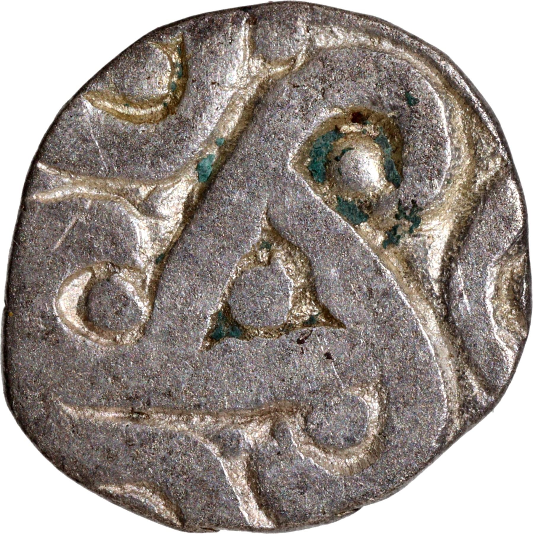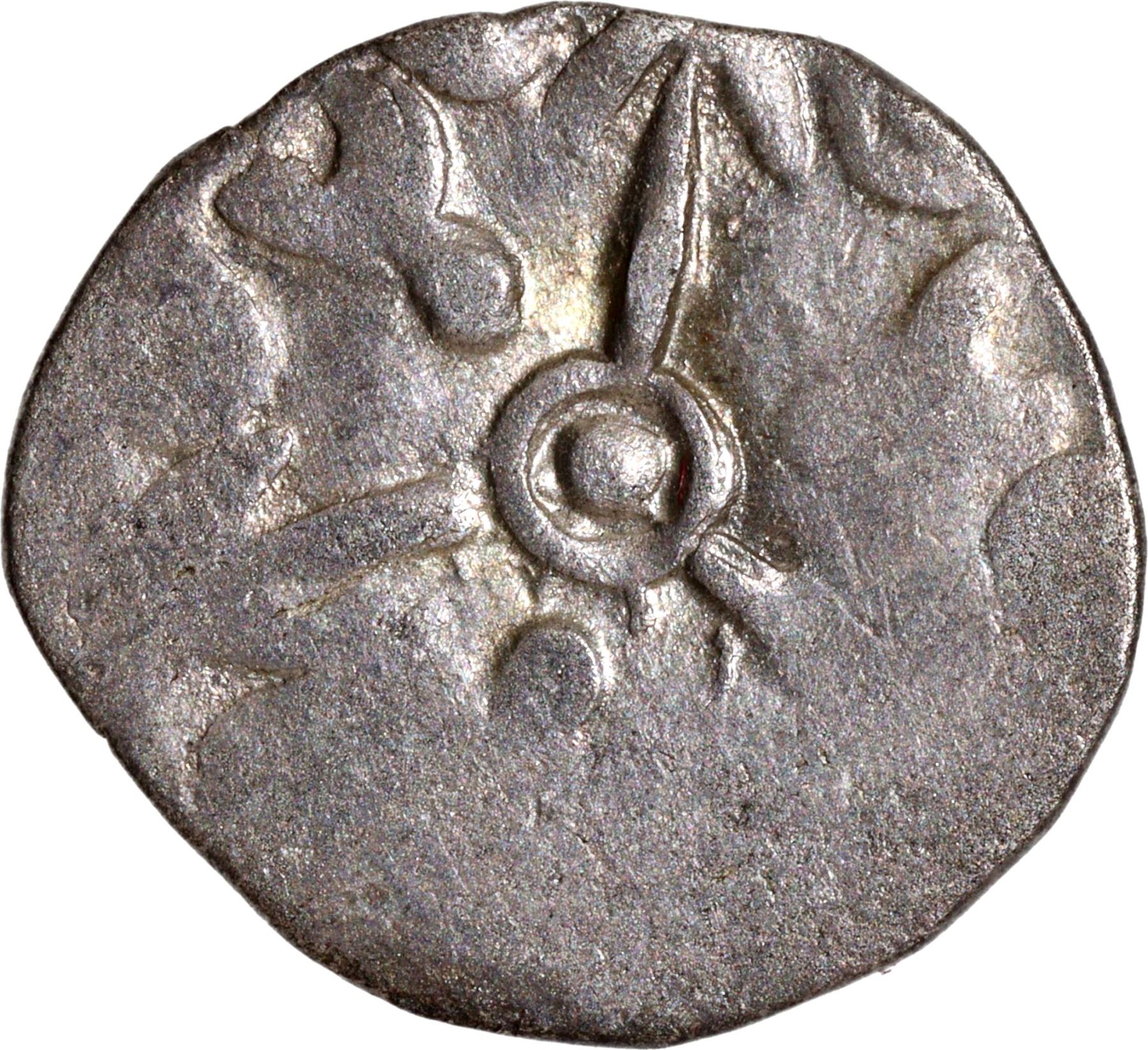 Punch Marked Coin, Kuru Janapada (400-350 BC), Haryana Region, Sugh/Babyal Hoard type, Silver ½ Karshapana, Archaic period, Obv: an ancient design Triskelion or triskeles consisting of a three-spiral design with rotational symmetry, comprised of dots and crescents, Rev: three-armed symbol with taurine in each arm, 1.4g, 16.2mm, (Rajgor Series 21/Hardekar 2019 # SG 4), about very fine, Rare.