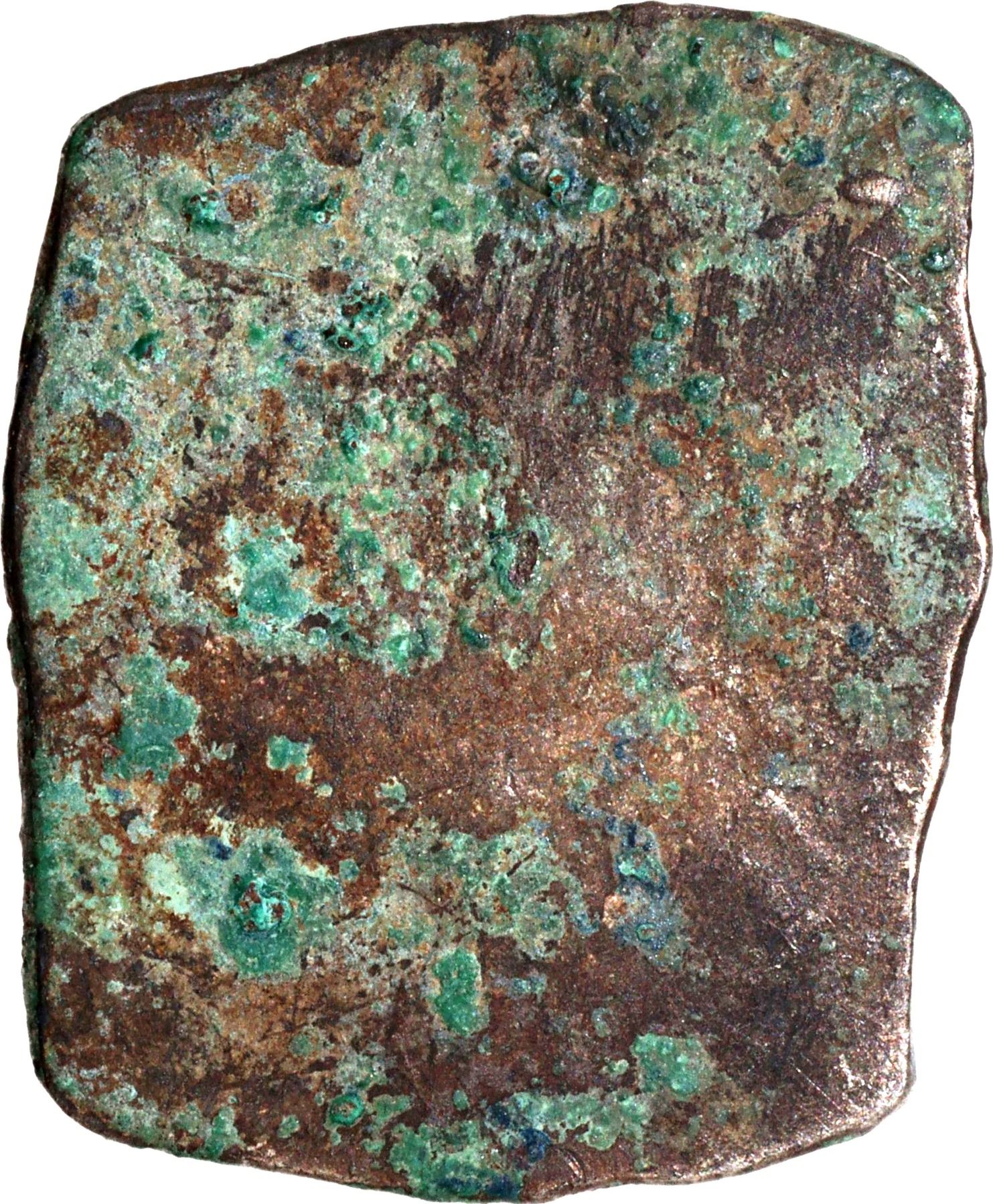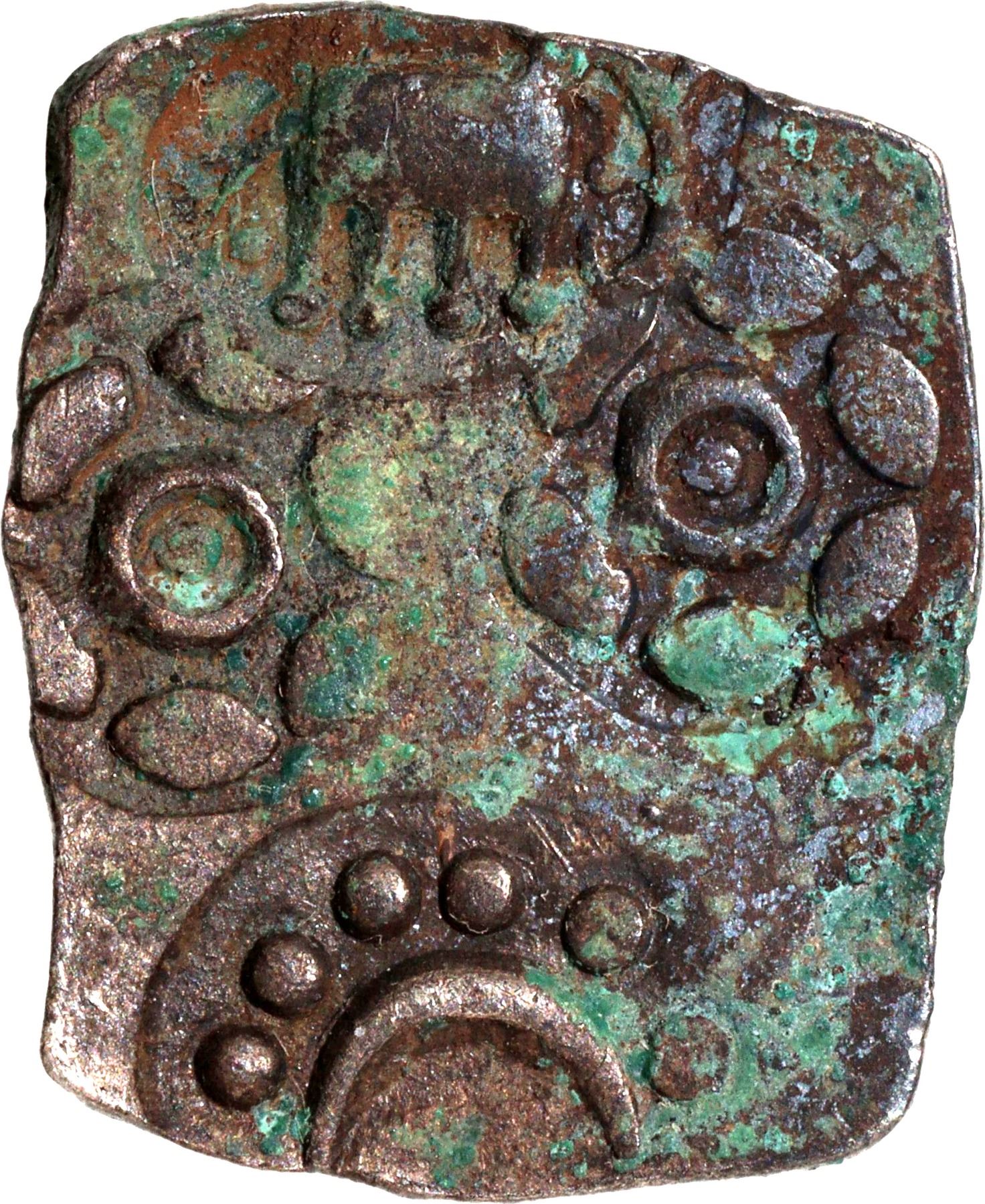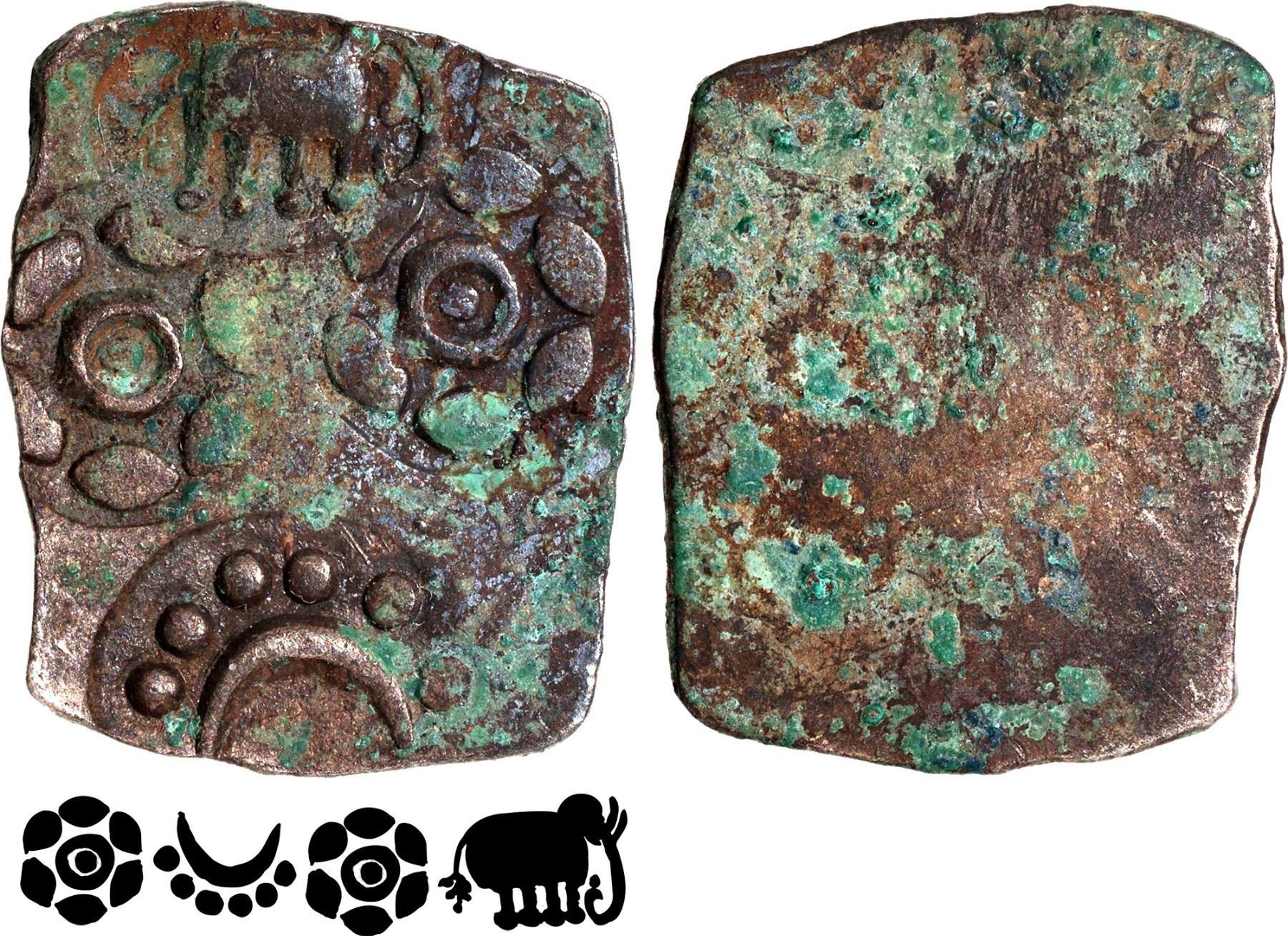 Punch Marked Coin, Vidarbha Janapada (600-300 BC), Painganga River system, Silver ½ Karshapana, Archaic period, ABCC type, Obv: four punches consisting of an elephant walking to right, a crescent with six pellets, 2x a circle surrounded by grain-shaped dots, Rev: uniface, 1.7g, 17.56x14.7mm, (PAIC # 138), about very fine, Rare.