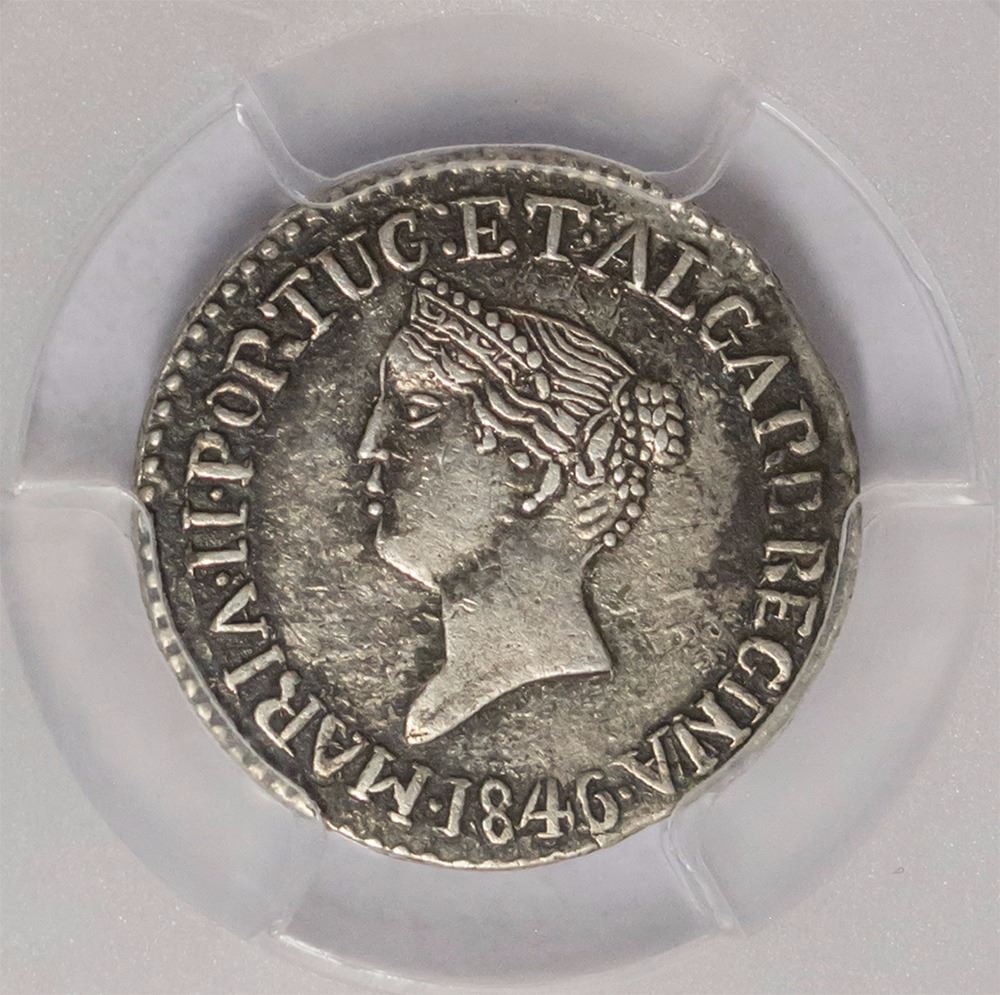 India Portuguese-Goa, Maria II, 1846/5, Silver 1/2 Pardao, Obv: head left, Rev: value in sprays, (KM # 271), slabbed and graded by PCGS as XF45, Rare.
