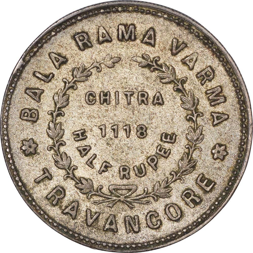 Travancore, Bala Rama Varma II, Silver 1/2 Chitra, ME 1118,Obv: shanku (conch shell) with sprays legend in malayalam: thiruvithamkoor arra roopa*chitra*, Rev: date and value within sprays, legend in english surrounds, 5.40g, 24.11mm, (KM #67), about extremely fine.