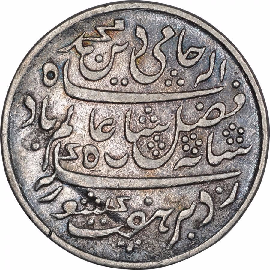 Bengal Presidency,Farrukhabad Mint, Silver 1/2 Rupee, plain edge,45 RY, In the name of Shah Alam II, Obv: "saya-e-fazle elah" couplet, Rev: sana julus zarb andcrescent (U),5.45g, 22.70mm, (PR # 329/KM # 76), about very fine, Rare.