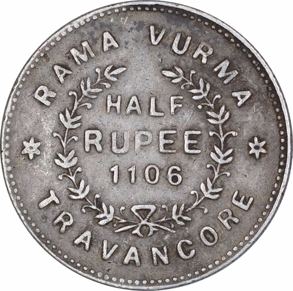 Travancore,Bala Rama Varma II, Silver 1/2 Rupee, ME 1106, Obv:shanku (conch shell) with sprays legend in malayalam, Rev:date and value within sprays, legend in english surrounds,5.4g, 24.06mm, (KM # 53), about very fine.