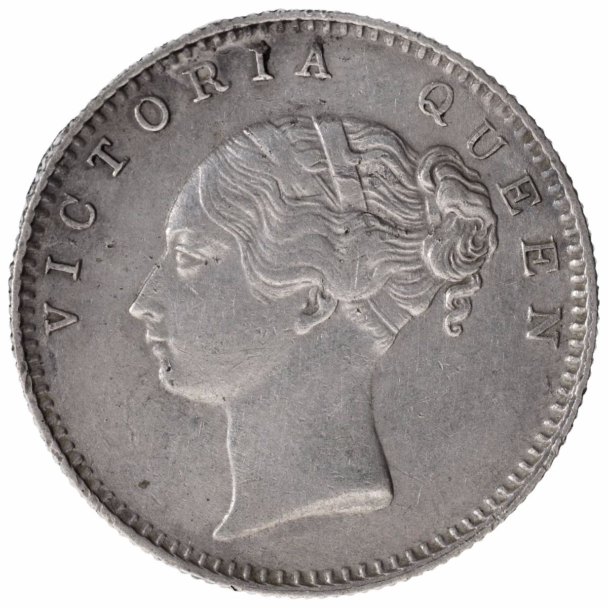 1840,Victoria Empress,Silver 1/2 Rupee,Continuous Legend, Bombay Mint,No initial, 19 berries(9L + 10R), (PR # 76),about extremely fine,Rare.
