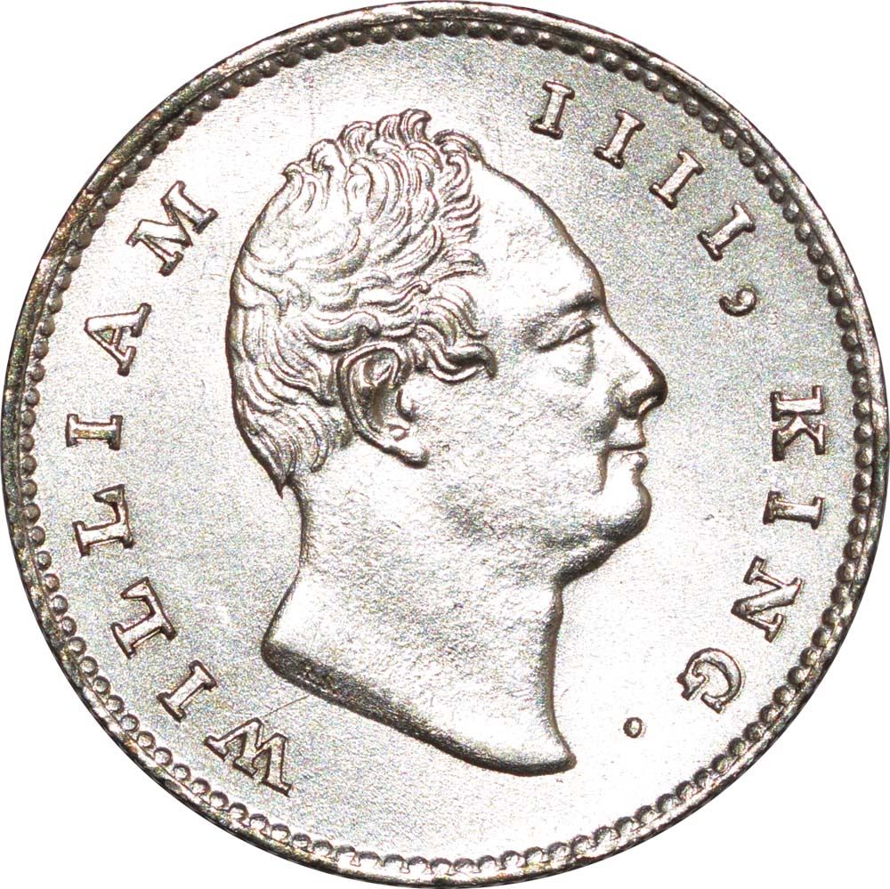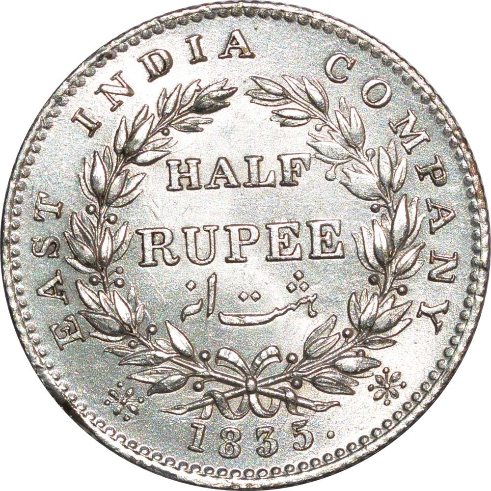 1835, King William IIII, Silver 1/2 Rupee, Calcutta Mint, R.S. incuse, 21 berries (11L + 10R), (PR # 66), Brilliant white UNC, ExtremelyRare.