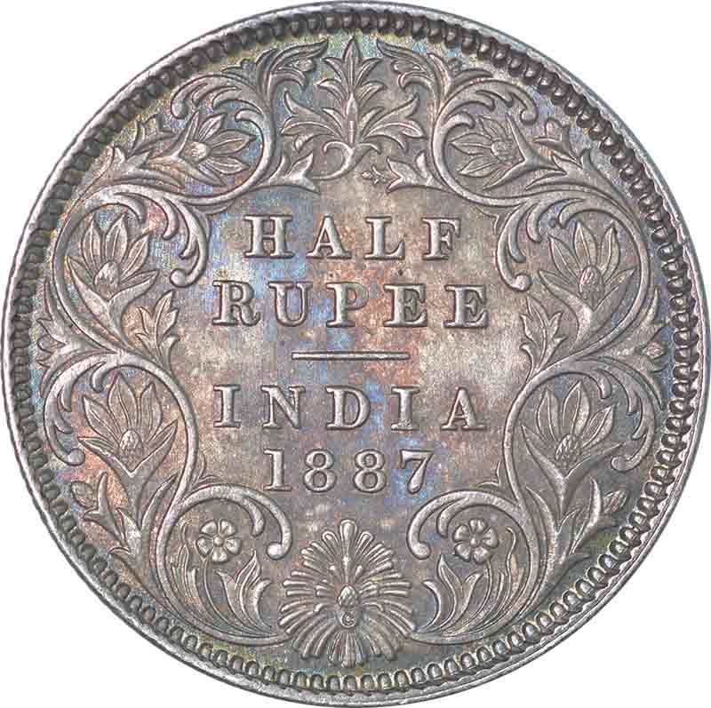 1887, Victoria Empress, Silver 1/2 Rupee, Calcutta Mint, A/I/C incuse, (PR # 271), unc details with rainbow toning, Scarce.