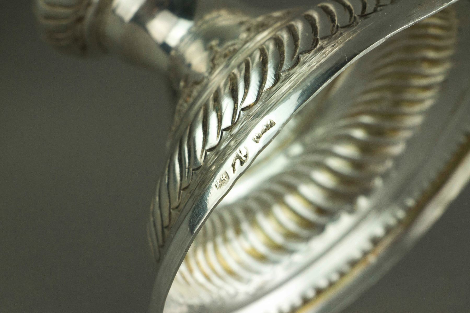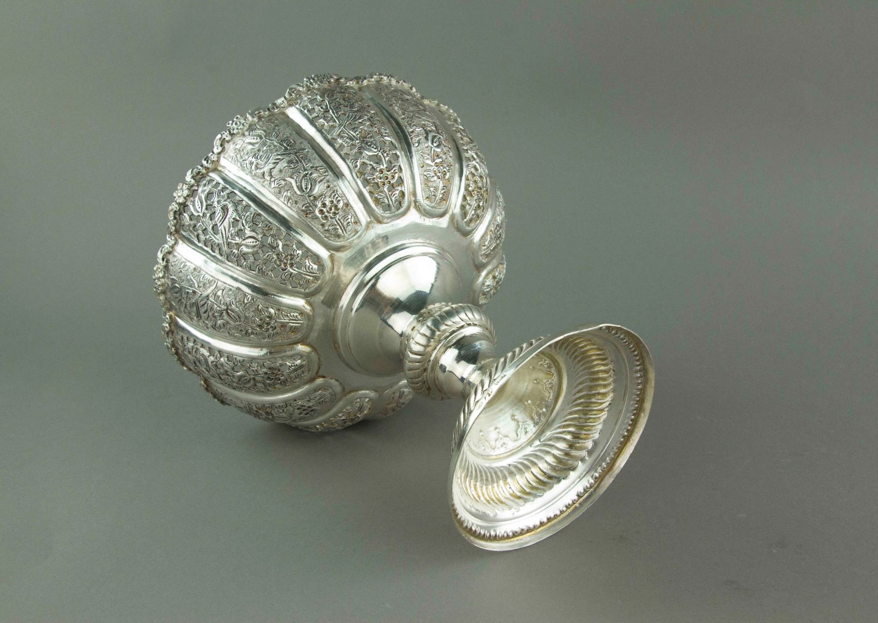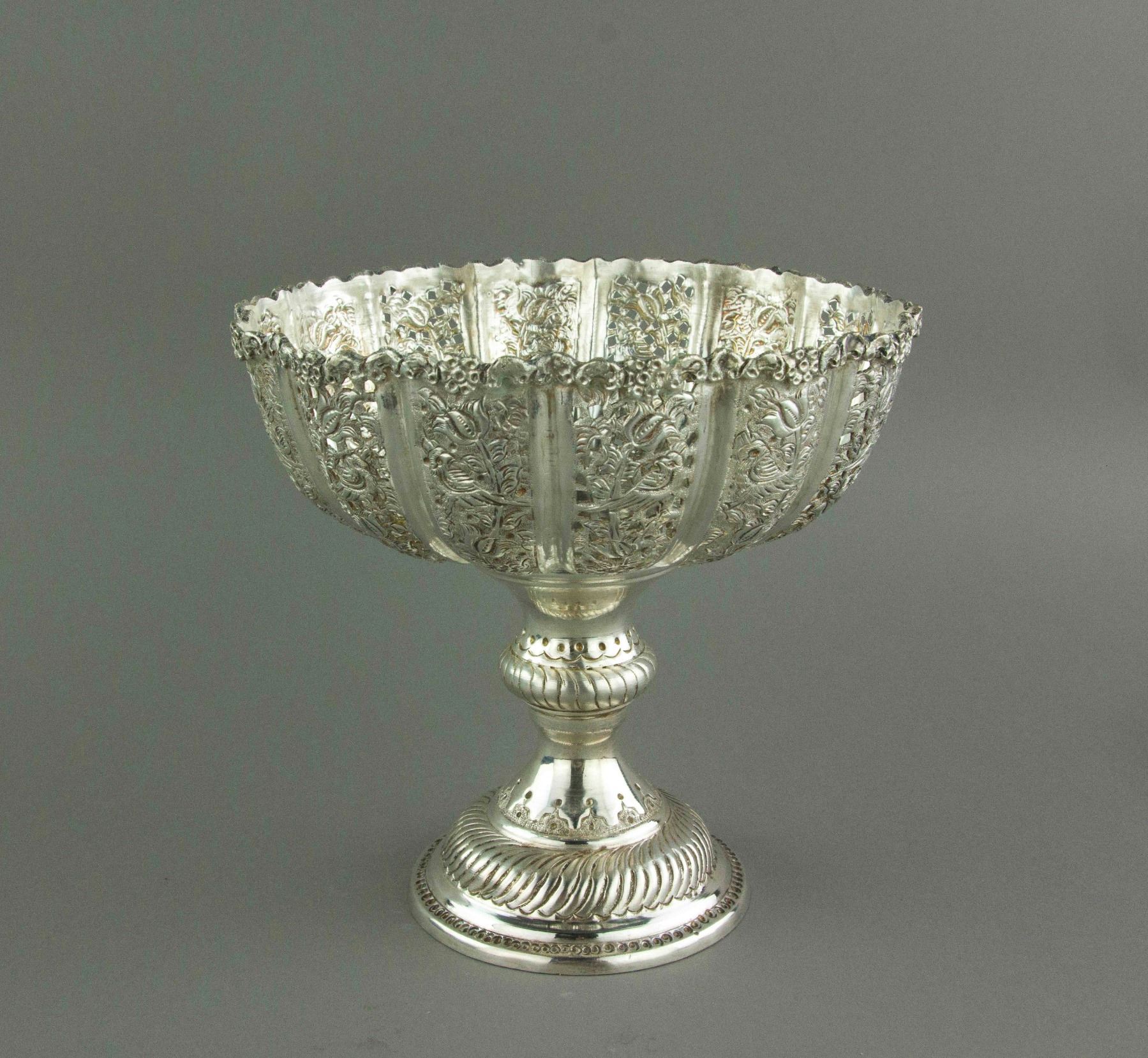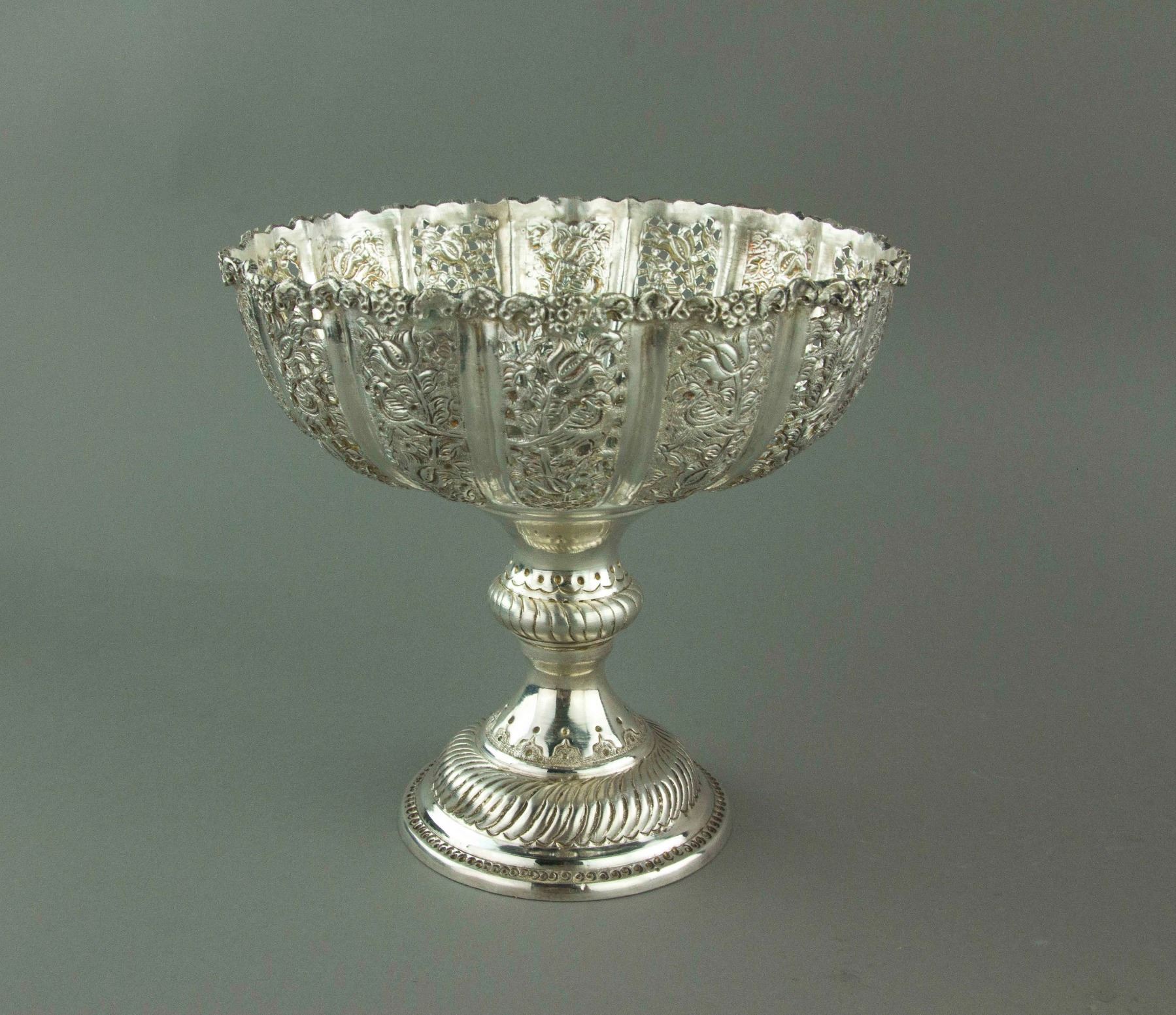 Silver made stem bowl; of lobed side supported on baluster-shaped foot; the exterior carved in low relief with birds perched on flower branches; stamped mark on foot rim; H: 16.5 cm, D: 18 cm, 423 grams