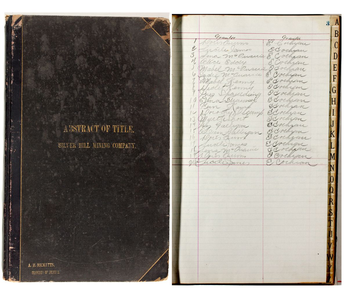 Silver Hill Mining Co. (Nevada Mining) Abstract of Title Ledger, 145 pages, containing claims bought and sold, leased, etc. In the Comstock Lodes areas. All claims listed are arranged alphabetically and list both "Grantor" and "Grantee." There multiple bills of sale and deed transfers, some dated 1860. There are 4 receipts of sale dated from mid-1914. Some of the names are prominent men of mining, among them John Bigler, who was the 3rd Governor of California. The is an anomaly within, a guest list for an "Electrical Workers Ball" dated May 8, 1914, and several poems scattered throughout the last half. The book measures 13.75" x 8.5". The covers are worn, but pages within are excellent. Rare and historical. -60349