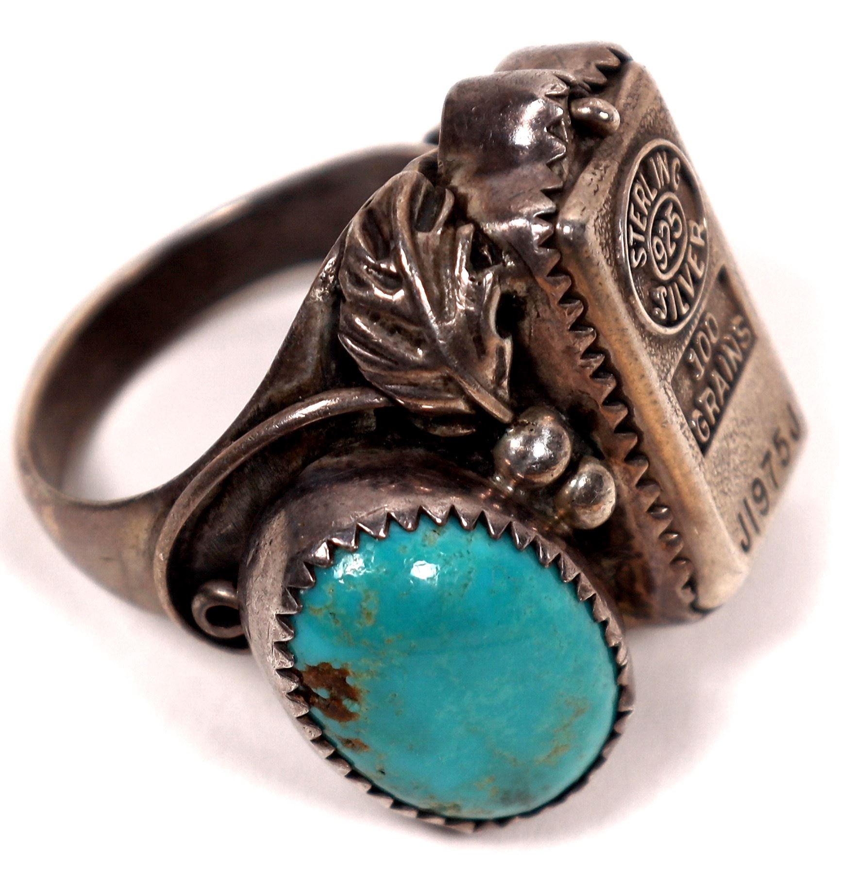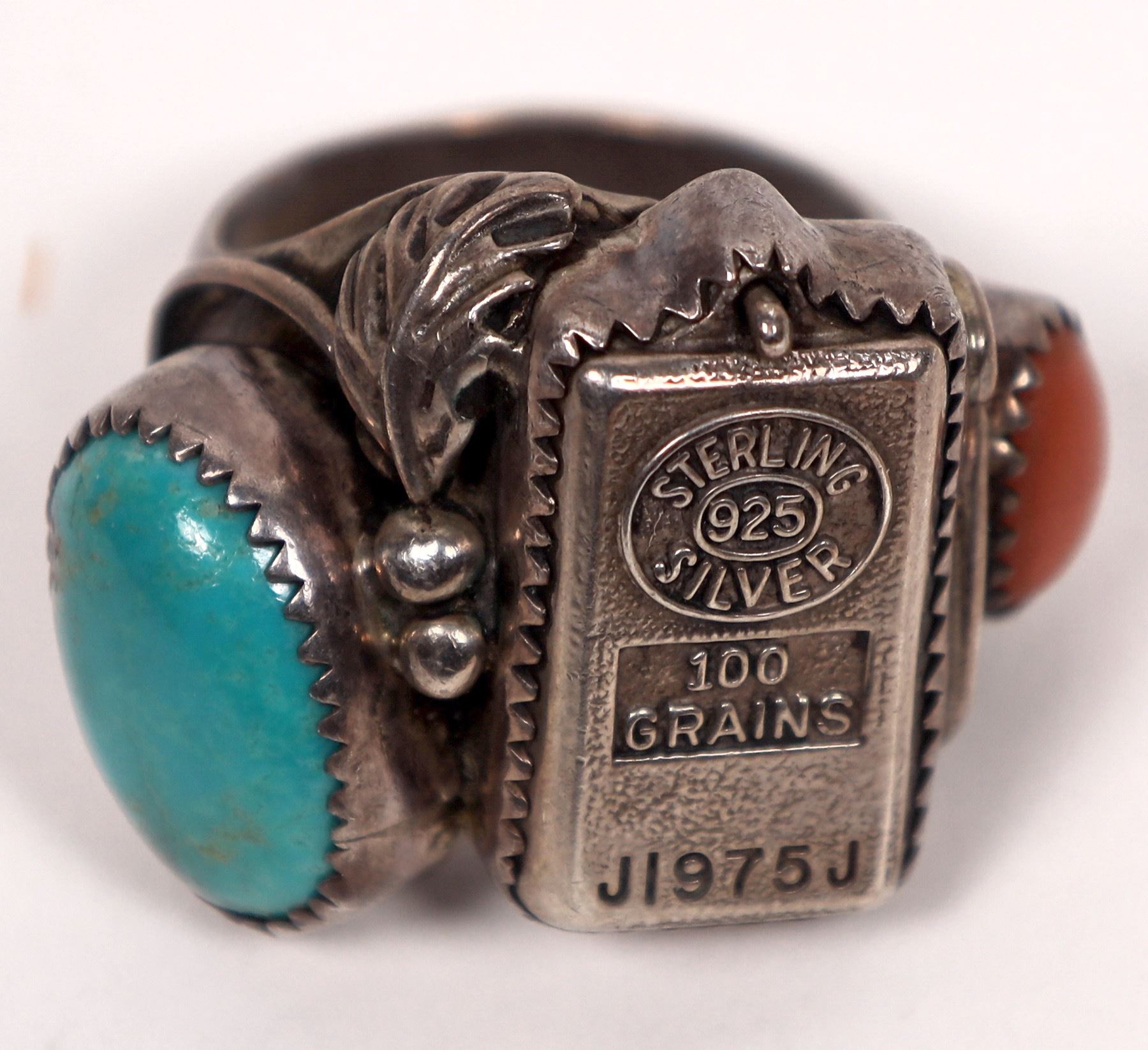 This size 8 ring has a sterling silver ingot at 100 grains as the center stone flanked by one coral and one turquoise stone on either side. Please see photos for details. Marked 925 sterling silver J1975J. City: State: Date:
