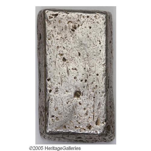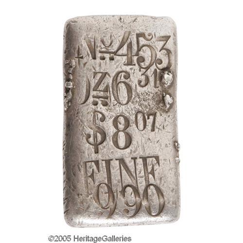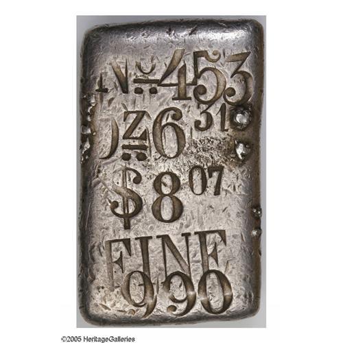 <B>Silver Ingot--Unknown Maker.</B></I> 6.31 ounces. No maker is indicated on this small-sized ingot, but it has the appearance of a late 19th century or early 20th century item. The serif lettering and fancy 5 are suggestive of a piece from this period. Only the top side has any information and it reads: No 453 / Oz 631 / $807 / FINE / 990. Several raised bumps are seen on the top side, and there are also several handling marks. Numerous small casting imperfections are noted on the back side.