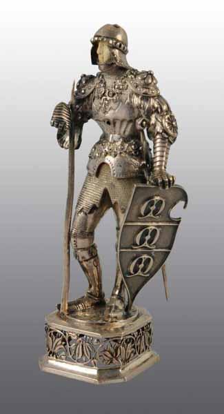 Description Weighs 16 troy ounces. German. Quite detailed with sword and shield. Condition (Excellent). Size 8 - 1/2" T.