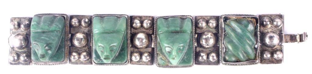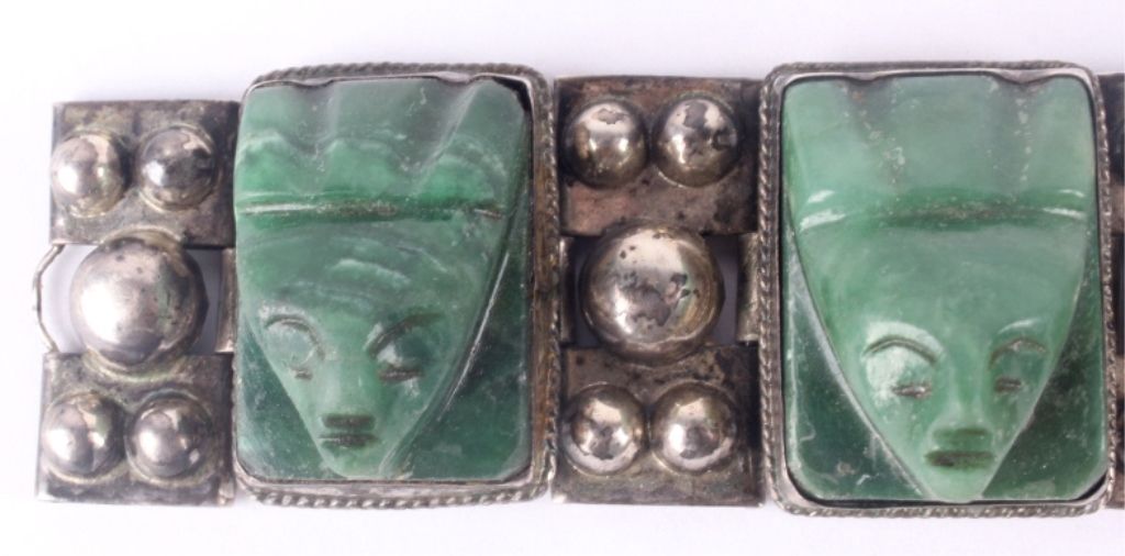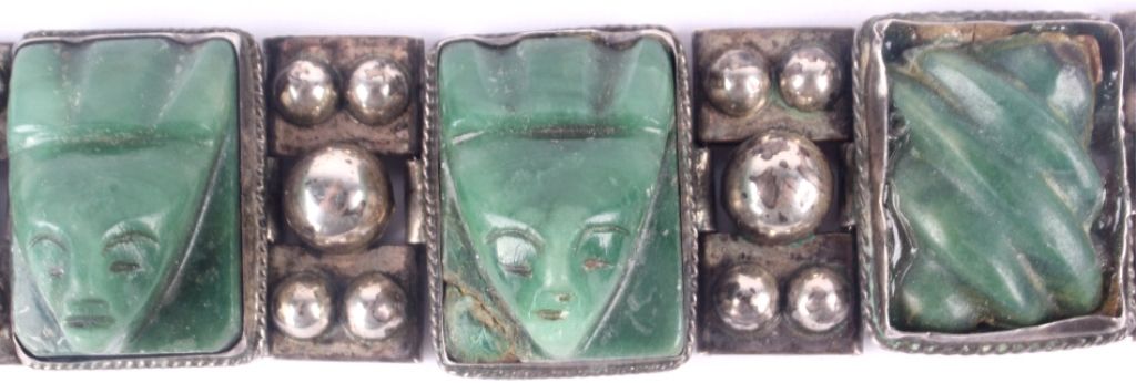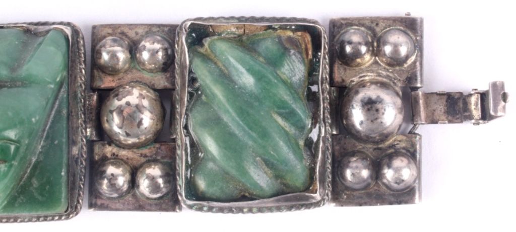 This lot features a Jade and silver bracelet. Silver accents highlight the expertly carved faces of this piece. It appears one of the jade stones was replaced at one time. The bracelet measures 1.25" x 6.25".