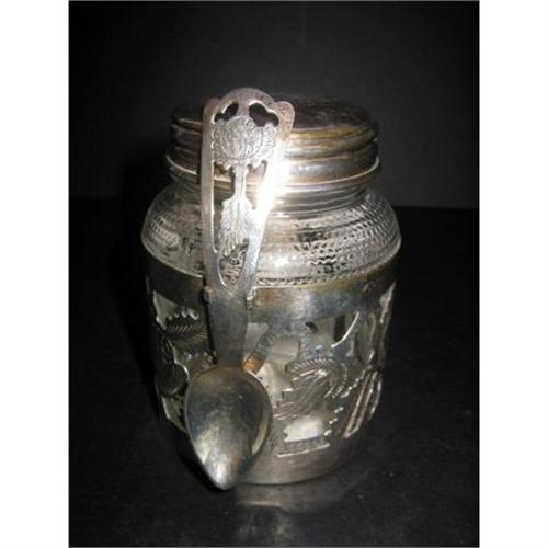 <tr><td>Title:Silver Jam Pot with flowers design w/spoon</td></tr>